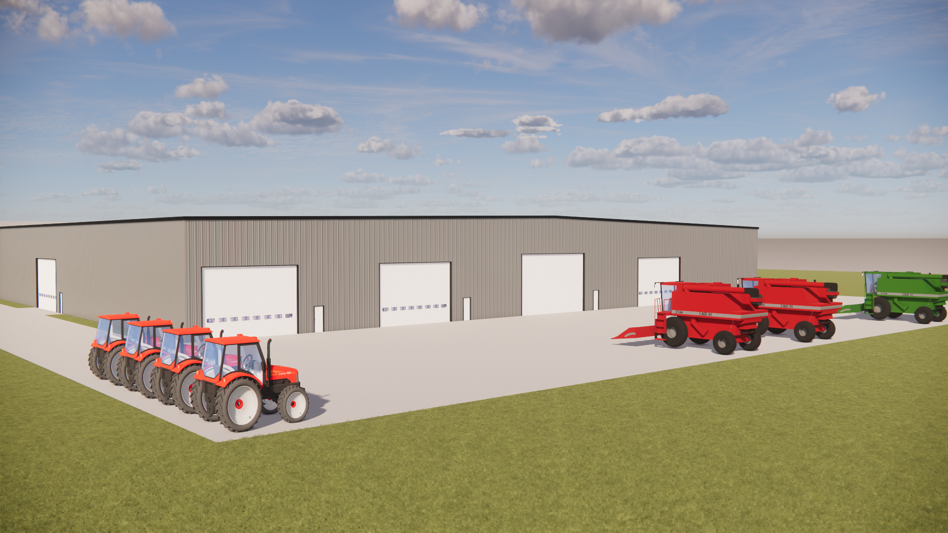keep all windows and doors the same size and location that they are siding shown grey metal siding rural setting with some trees in the far background used concrete paving