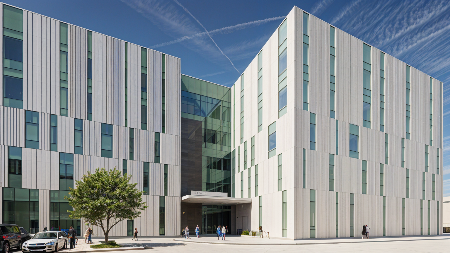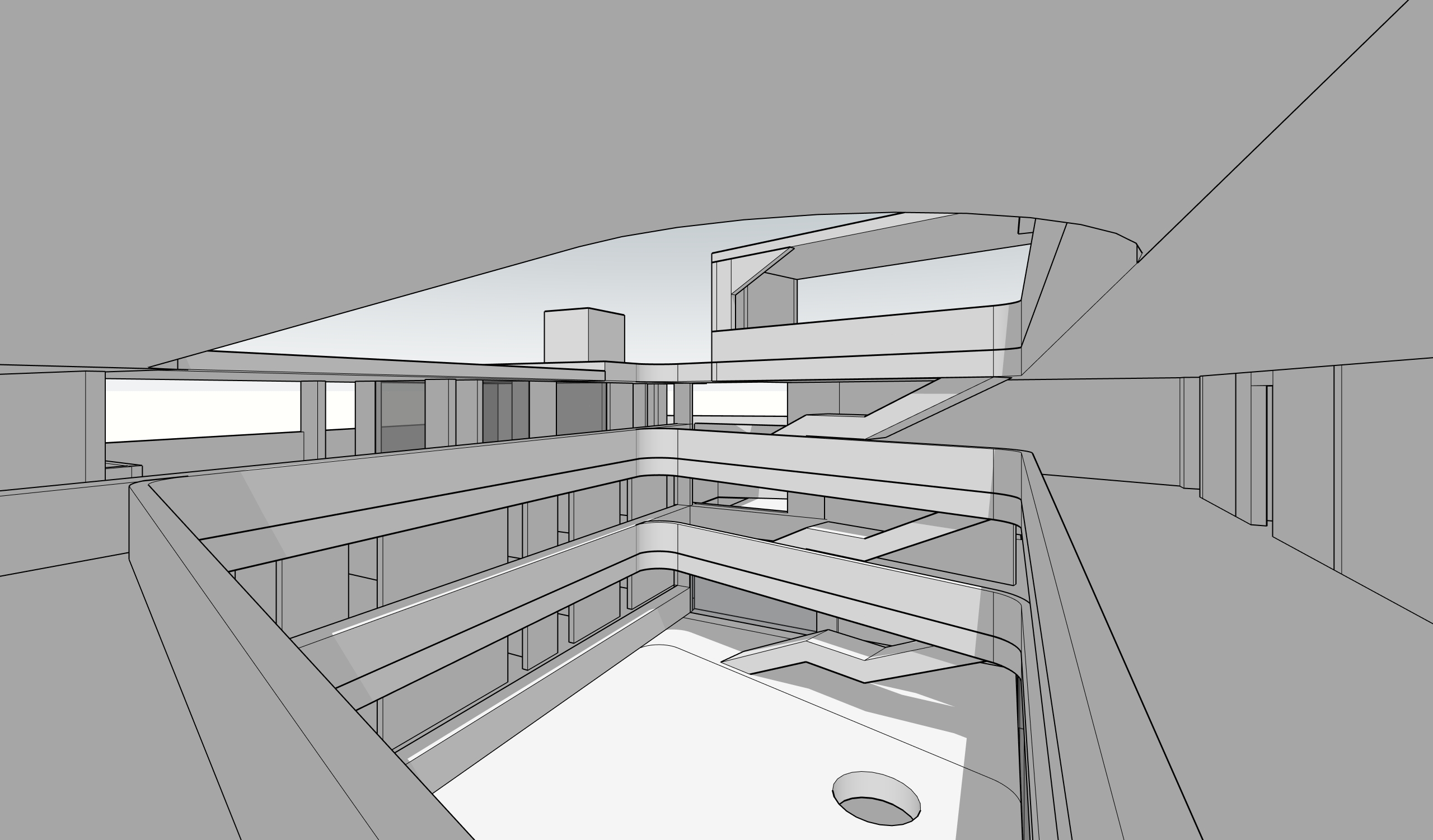 tropical modern boutique 4 story hotel with open courtyard and basement parking this view is from the third floor hallway which surrounds the open courtyard and shows the said open courtyard in the middle there is a round light well going into the basement parking below use neutral earth tone colors and materials suitable for a tropical climate architecture