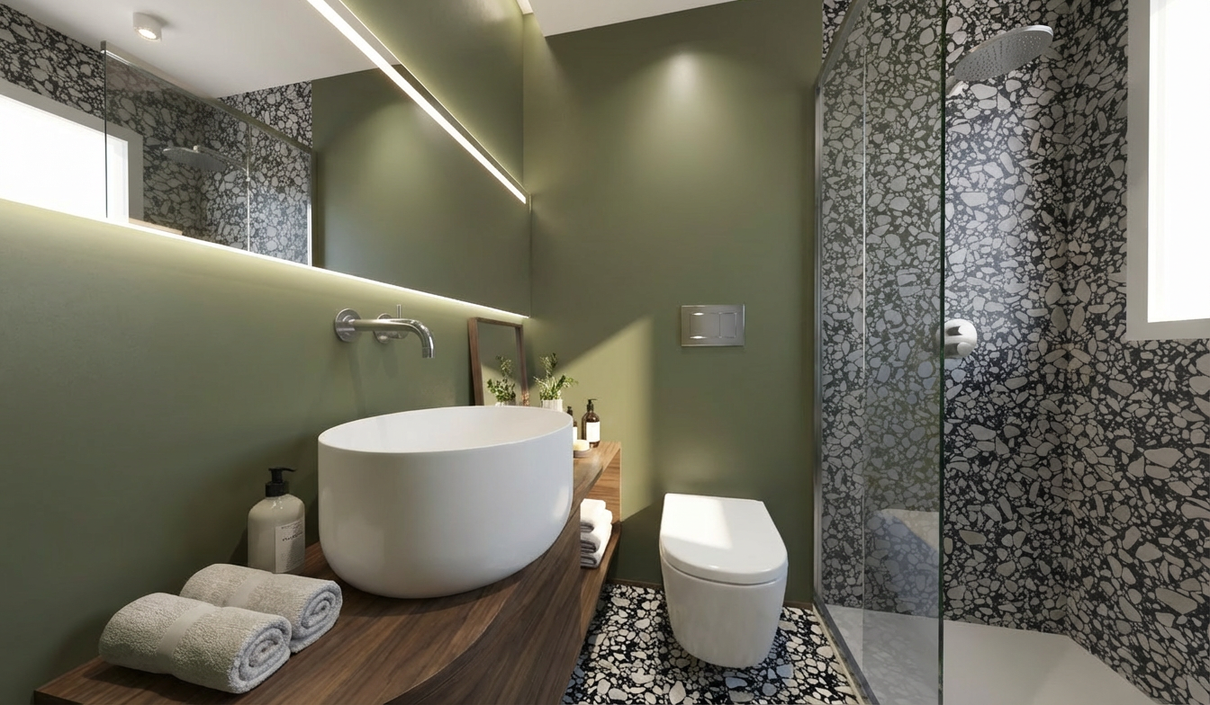 bagno con resina verde di colore oliva sulla parete di sinistra e dietro al wc il lavabo e il wc sono in ceramica bianca opaca e la rubinetteria cromata sotto al soffione della doccia non c il miscelatore e il doccino il box doccia in vetro trasparente lo specchio sopra al lavabo ha una retro illuminazione con strip led sopra e sotto il soffitto bianco e c un faretto che illumina il lavabo e uno che illumina il wc fai entrare un p di luce naturale dalla finestra metti qualche dispenser di sapone sulla piana del lavabo