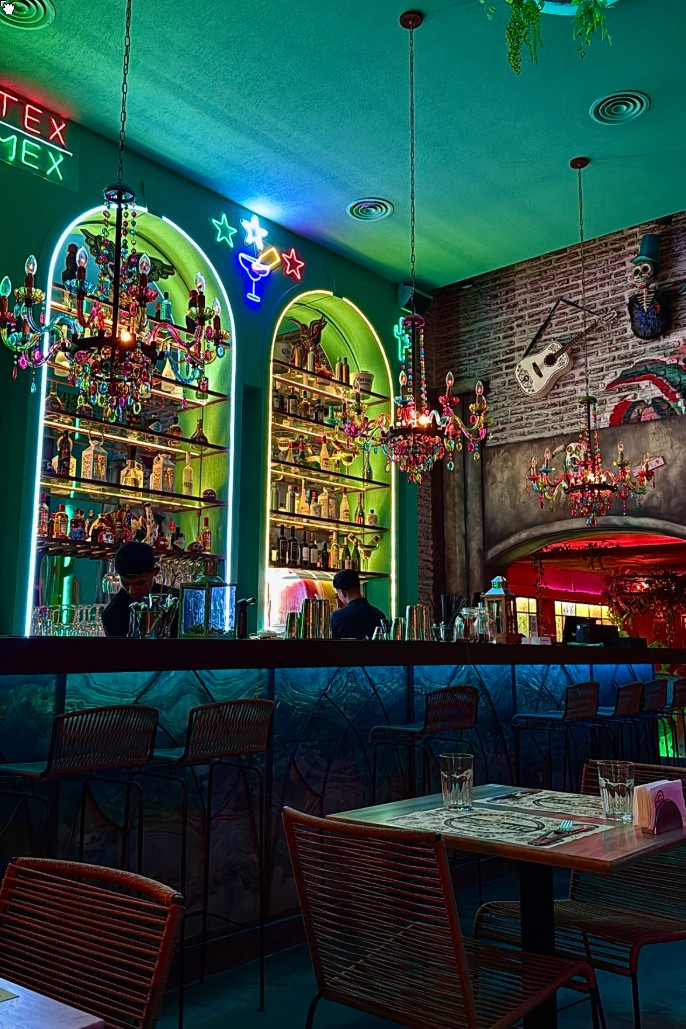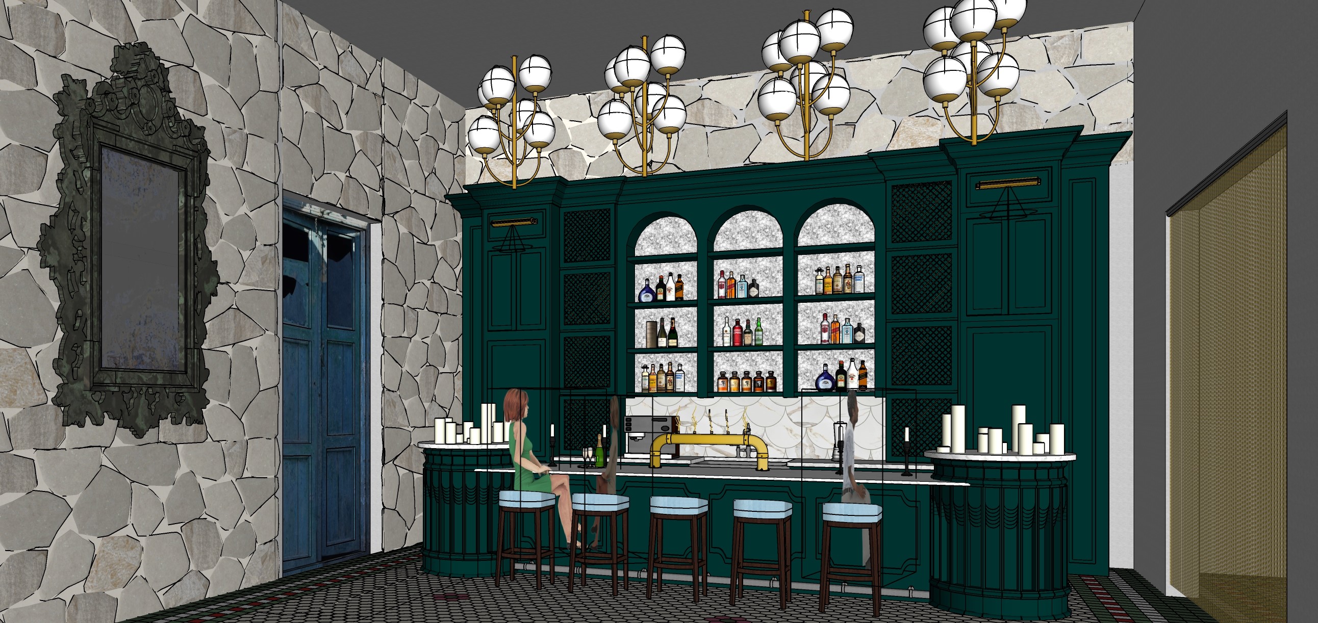 interior shot interior of a stylish vintage bar with a luxurious atmosphere the walls are made of rustic light gray stone creating a medieval yet elegant backdrop the bar and shelving are crafted from rich dark teal wood adding a touch of class the bar counter stools and cabinets exude sophistication with accents of gold and soft muted blue upholstery on the stools overhead globed chandeliers in white and gold illuminate the space with a warm glow the floor features intricate mosaic tiles in dark gray red and black adding texture and depth a large ornate mirror with an antique bronze frame enhances the vintage charm the wooden door is painted in a deep blue weathered finish contributing to the cozy mysterious atmosphere a sense of warmth and luxury permeates the space with neatly arranged bottles on the shelves behind the bar giving an inviting feel