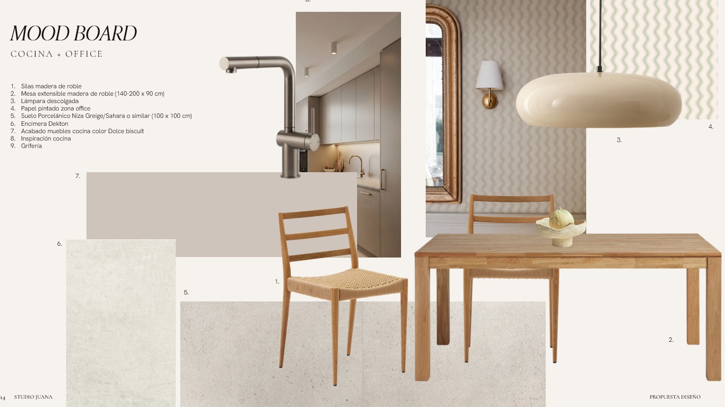 exterior shot photorealistic architectural render perfectly frontal elevation view of a kitchen wall the composition is orthographic straight on no perspective distortion on the left side a full run of kitchen cabinetry with refined modern detailing directly in front of these cabinets place a rectangular dining table with six elegant chairs arranged neatly on the wall include a large window showing a lush green garden outside rich vegetation and natural daylight the window must have a soft beige linen roman shade partially lowered materials must look realistic high detail textures natural lighting subtle shadows ultra realistic 4k quality clean styling interior design magazine aesthetic balanced composition no people