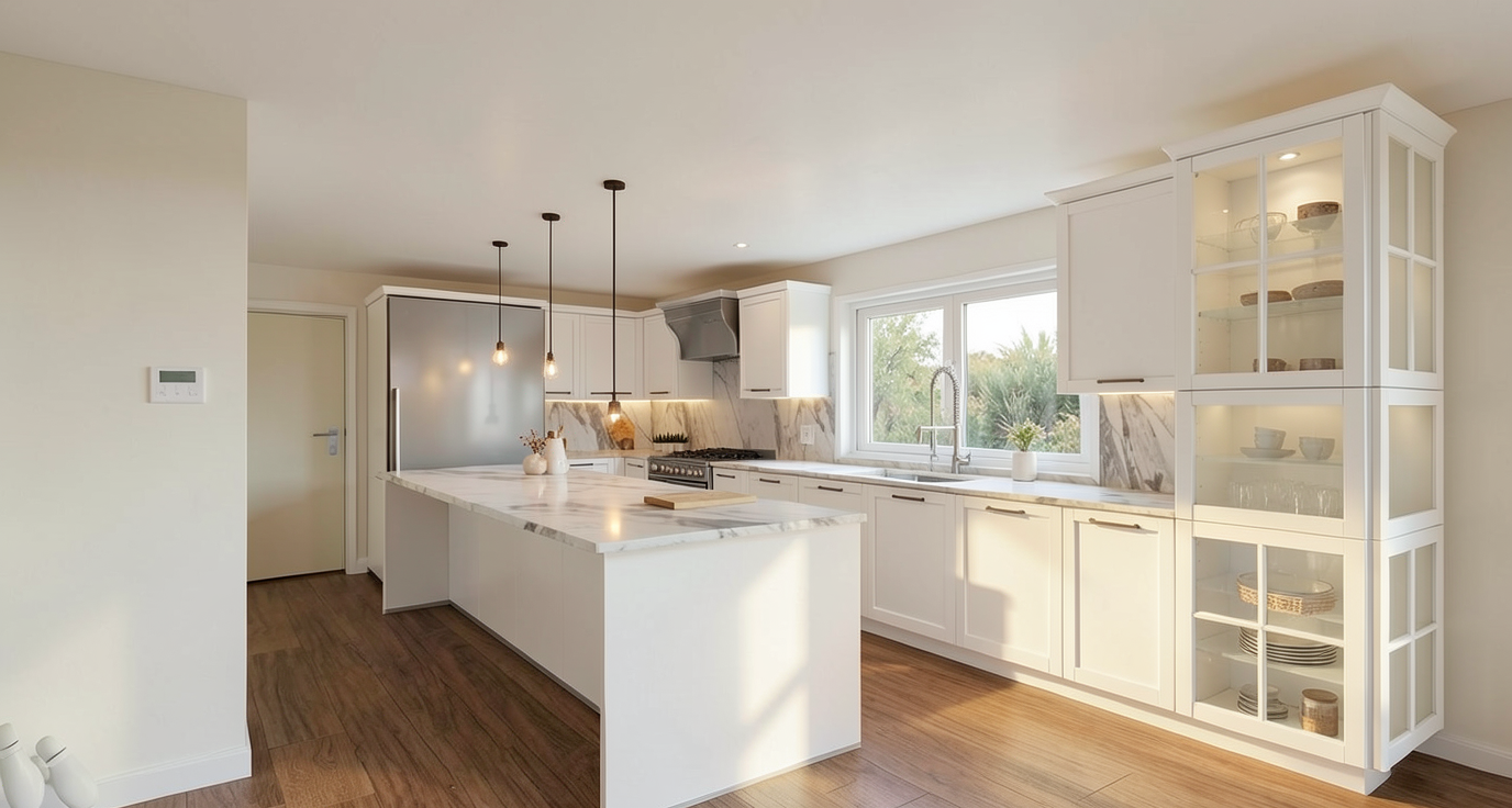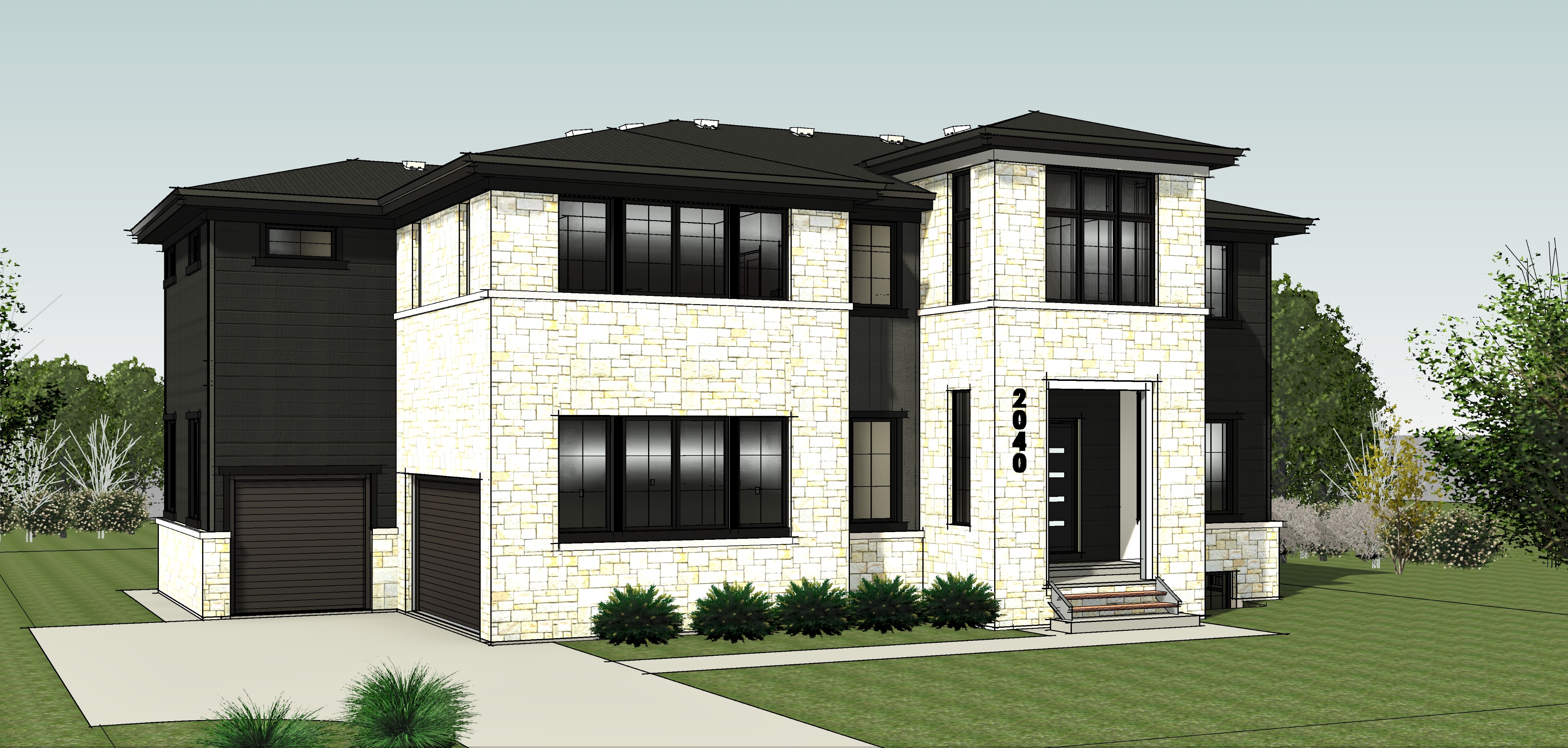 render a photorealistic 3d perspective of this house in a park ridge il reference the current material style just enhance them black asphalt roof and soffits lap black cement board siding beige stone veneer and black window frames keep model geometry the same windows doors roof walls black garage door pavement driveway use marked vegetation that looks native to park ridge il do not change the view add a car in the driveway only enhance the current materials and make the landscape realistic detailed textures in the lap siding and glass reflections and a vibrant clear sky with light atmospheric depth and few clouds render in hyper realistic architectural visualization quality 8k resolution