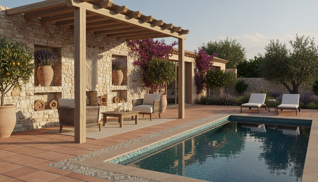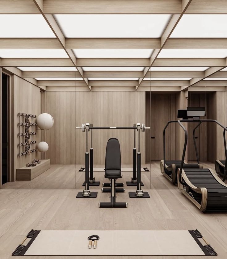 indoor basement gym light muted timbed tones with coffer ceiling led panels back wall is exposed beige toned small format freeform rock cladding no visible doors