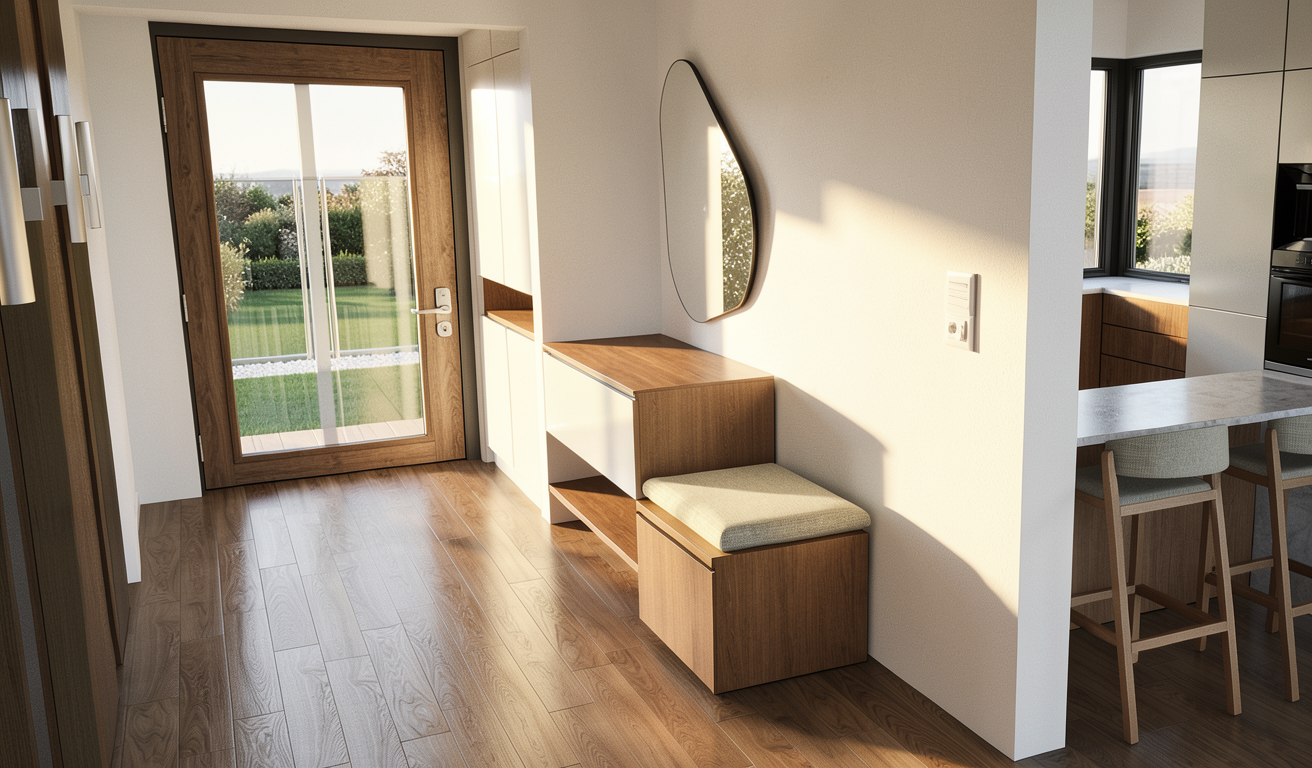hyper realistic architectural photography high end interior design soft natural sunlight streaming through windows long soft shadows subtle ambient artificial lighting dimmable warm led accents realistic textures 8k resolution highly detailed shot on phase one xf global illumination raytraced reflections clean minimalist aesthetic lock all previous settings subject only add outlines at the two circles in the ceiling