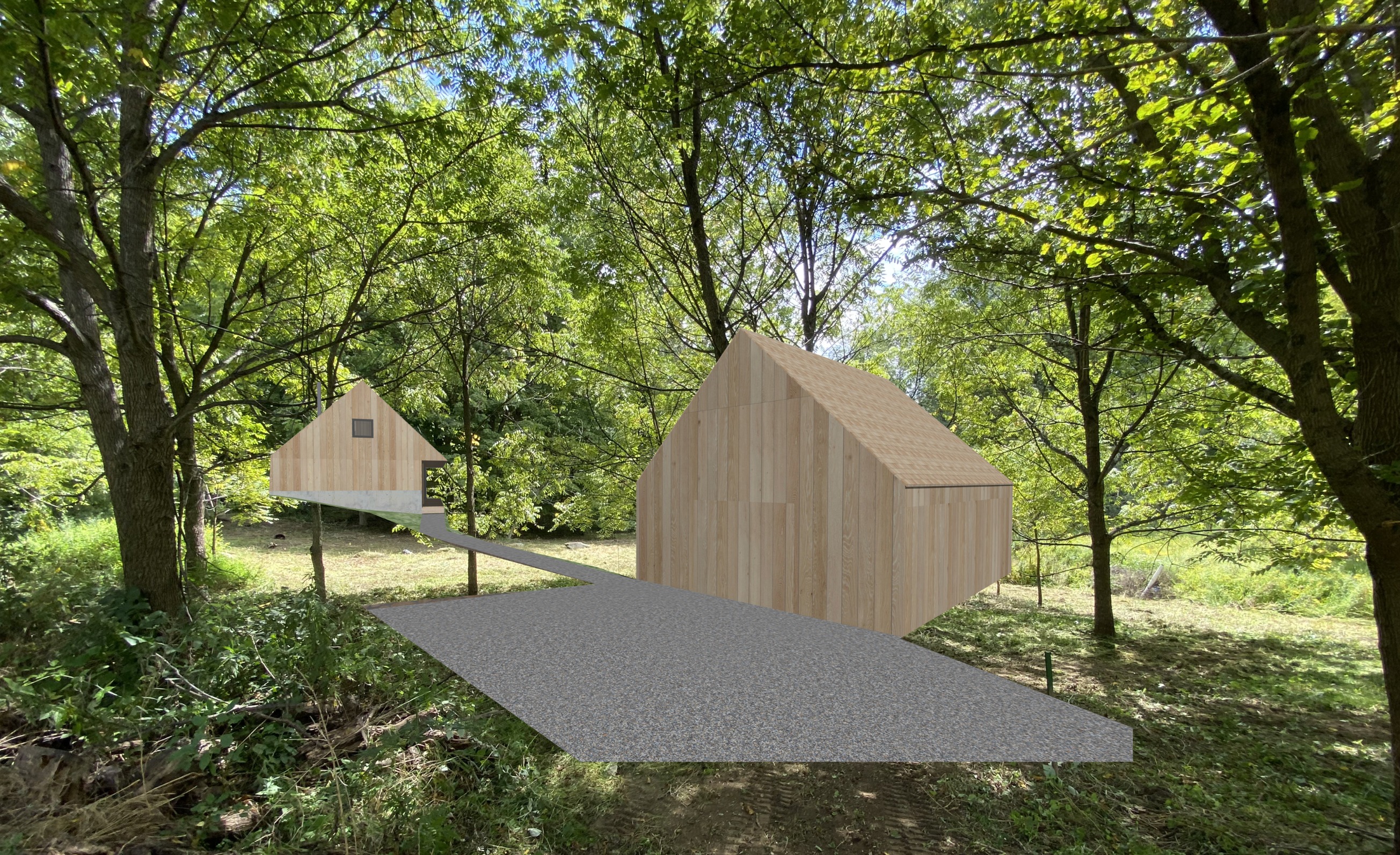 a modern wooden cabin nestled in a lush forest the cabin is made of light natural wood with vertical paneling the foreground features a gravel driveway in shades of soft gray surrounding the cabin are vibrant green trees that create a serene canopy sunlight filters through the branches casting gentle shadows on the cabin and ground the atmosphere is peaceful calm and inviting evoking a sense of harmony with nature the building in back disappears into the forest