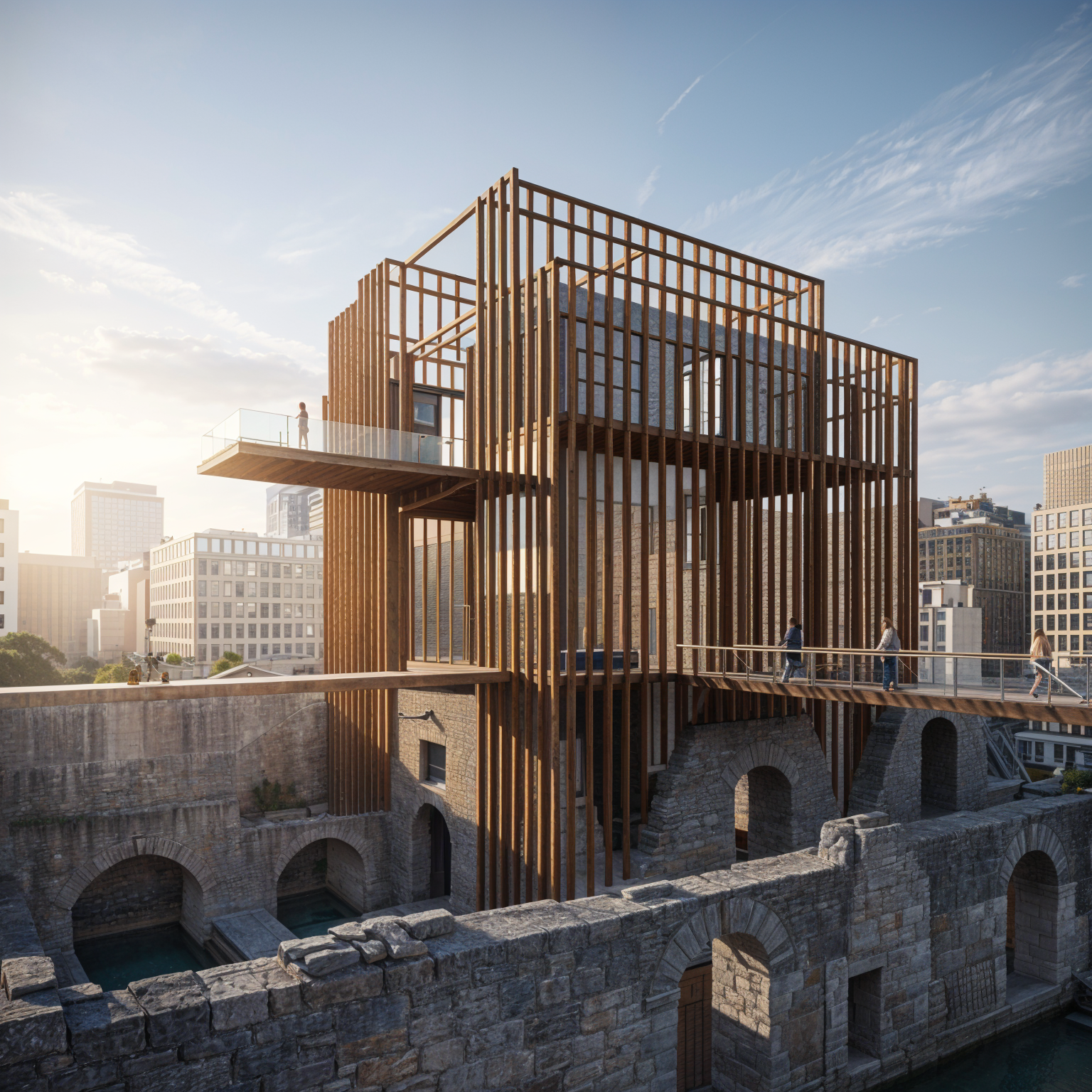high tech exterior shot old ruins thin corten steel bars modern architecture