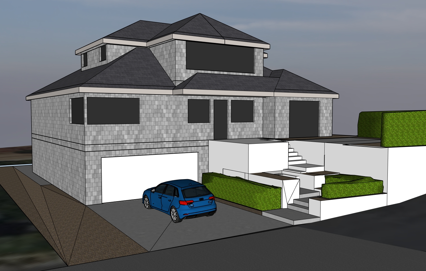 colonial revival exterior shot gray and white cottage with street in front mountain behind architecture