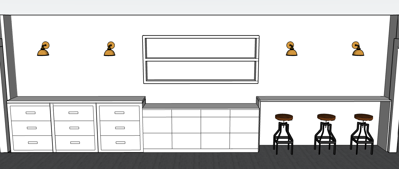 the three boxes to the left are for lateral filing cabinets the area on the far right is for bar height seating the circles above are farmhouse wall lights the center rectangles above are floating shelving style theme is modern farmhouse architecture