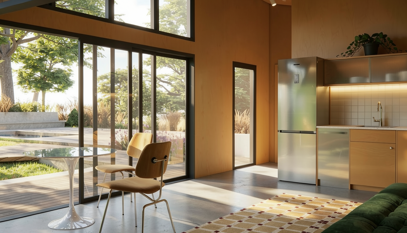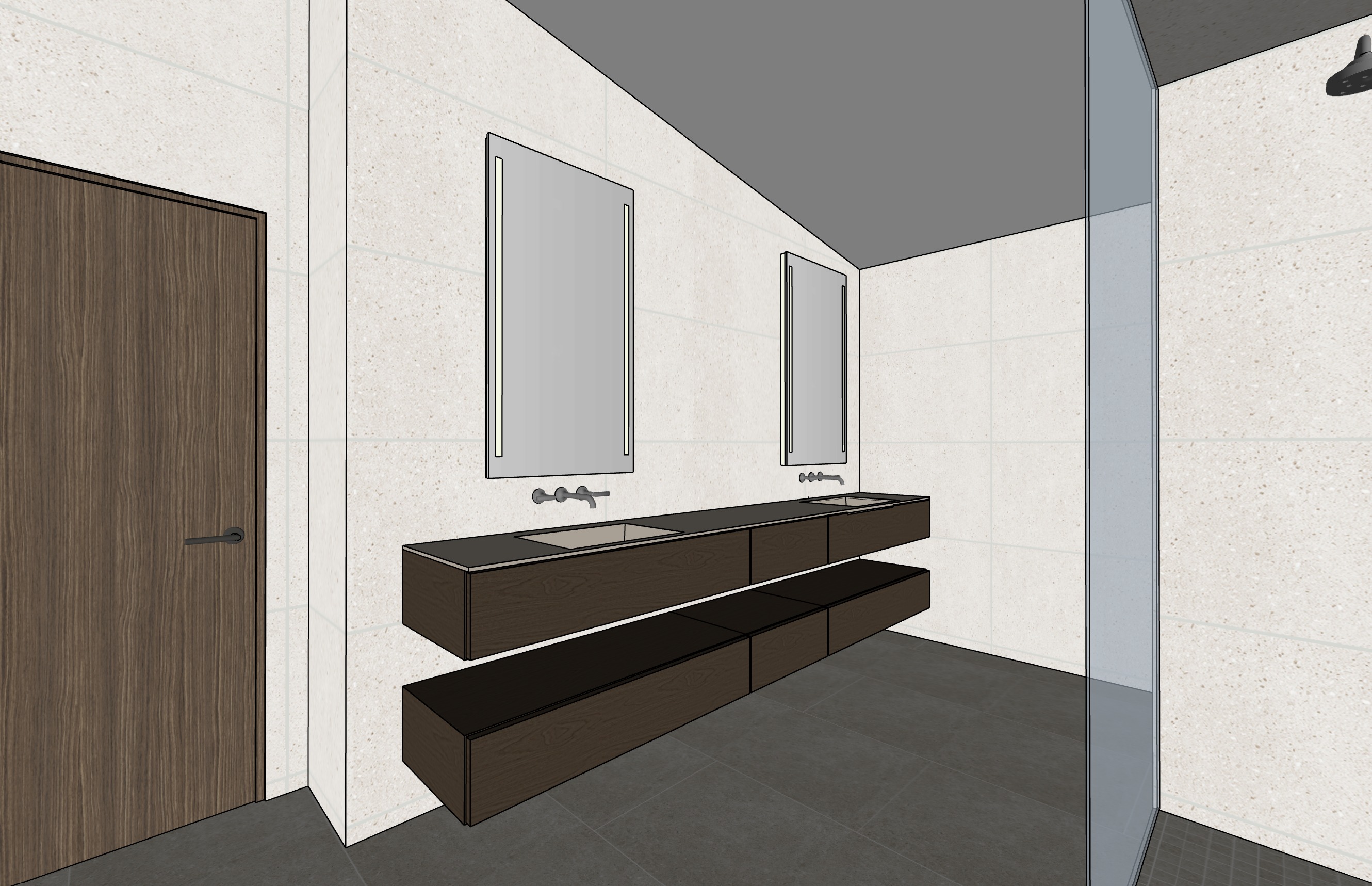 photorealistic enhancement of the provided architectural render preserve the exact architecture layout materials furniture placement and fixtures from the original image with no redesign or modifications the purpose is only to improve realism and lighting quality render as high end interior photography using a full frame camera with a 24 35mm architectural lens balanced exposure realistic dynamic range subtle depth of field and natural color grading the image should look like a professionally photographed luxury interior rather than a computer render soft natural daylight diffused window light global illumination balanced exposure do not change architecture do not change materials no redesign no new objects no additional lights no glowing fixtures no light from shower heads or faucets no dramatic shadows no surreal lighting no warped geometry no stylization the windows looking out to the exterior should be displaying mountains in the distance some trees the plumbing fixtures should have an antique nickel finish the space should not look dark and ominous the room needs to be filled with soft bright light the mirrors should be led mirrors that are both front and back lit