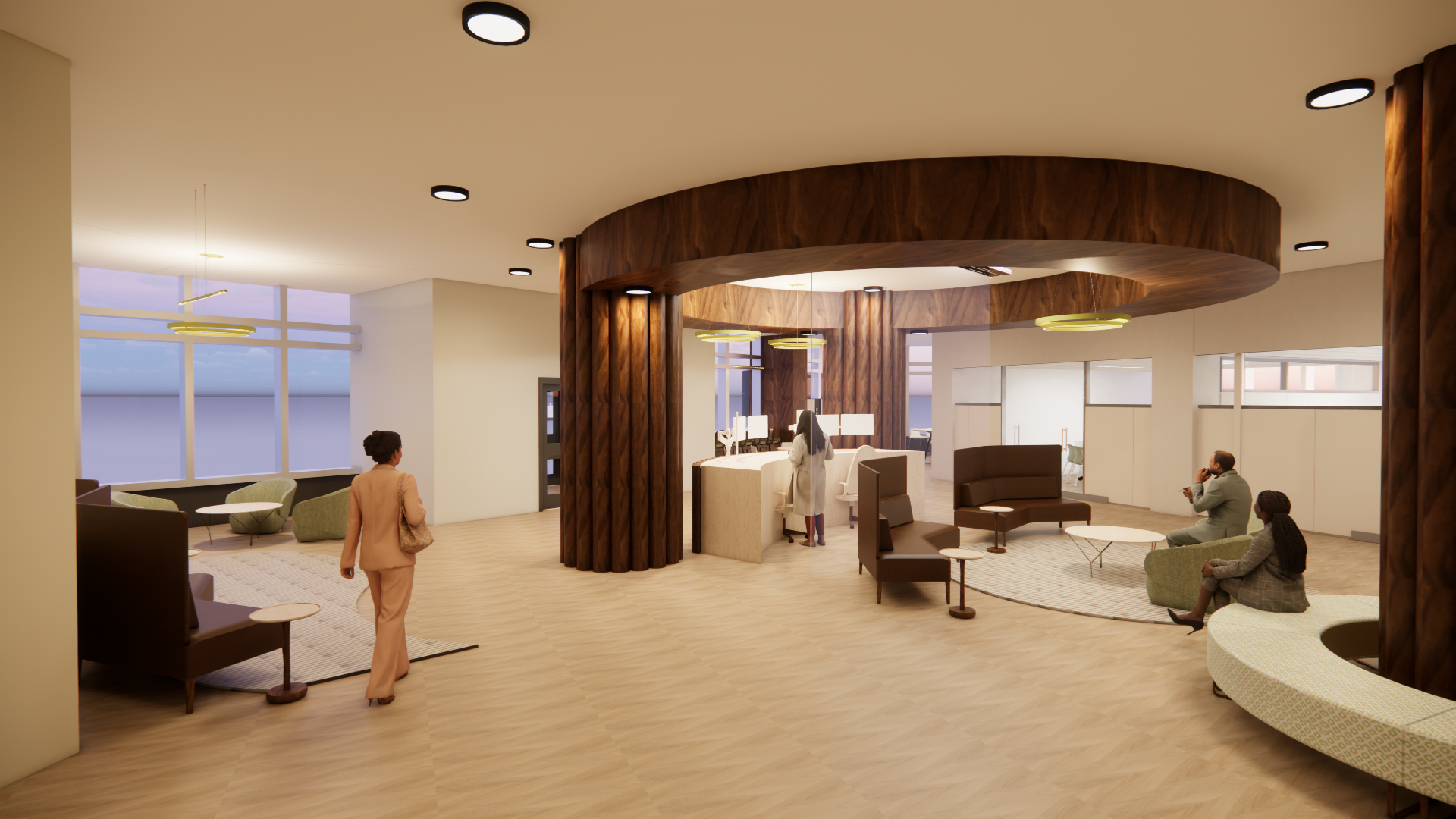 this is an original rendering which isnt great i want you to enhance it as best you can it is a breast cancer clinic for women i want you to especially enhanse the check in desk and show a paitent on the other side by the front doors checking in for their appointment also add more funiture to fill uo the space and a rug the colors are neutrals soft pink and deep green i attached some fabrics and leathers