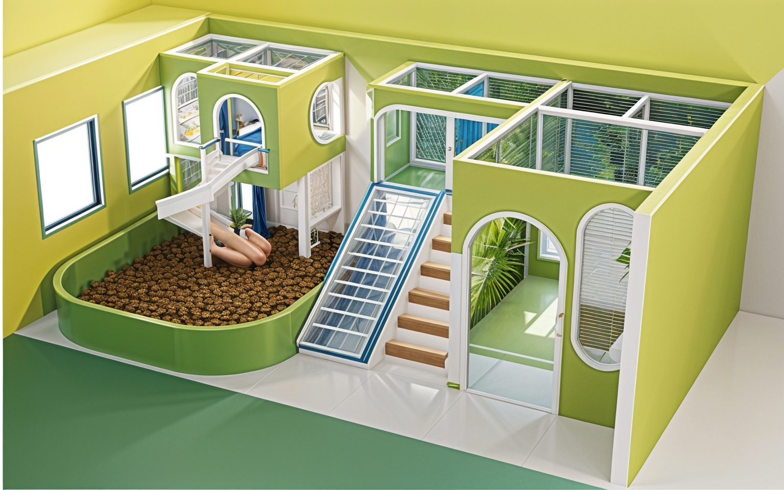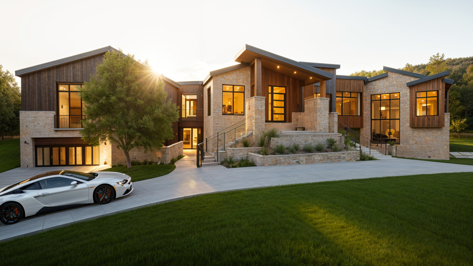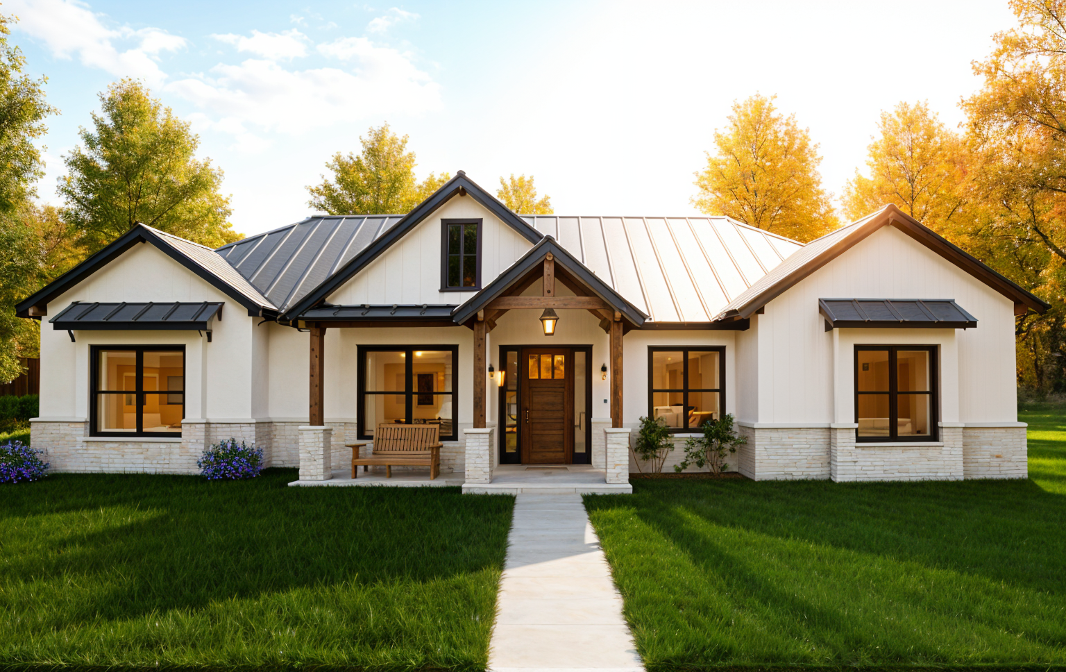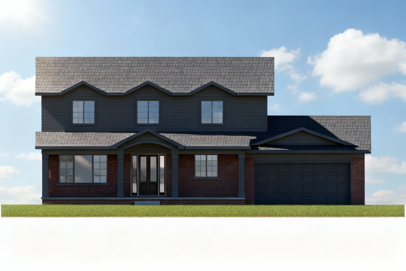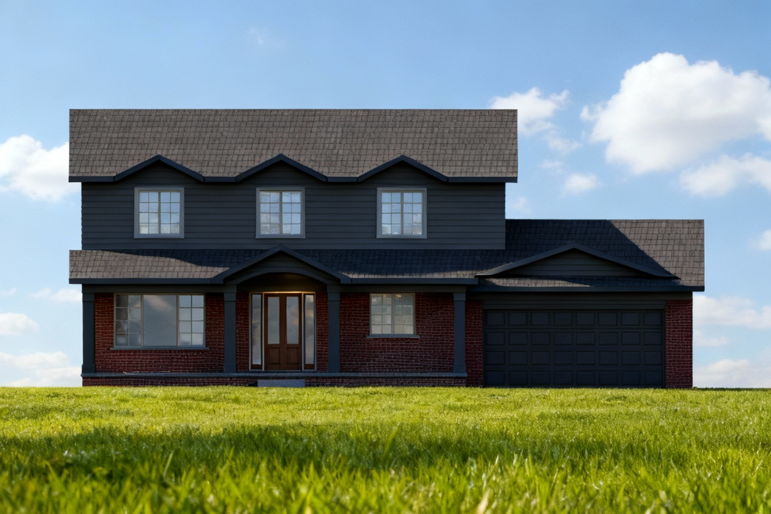 exterior shot architecture have dark gray siding 3d rendering with dark gray trim and column mixe brick with red and dark red please have soft shade and the picture more realistic and bright move shade to other side and use dack gray for garage door use more realistic glass window for second floor too noon sun shade more sun with soft shade ad concrete drive way and front walk