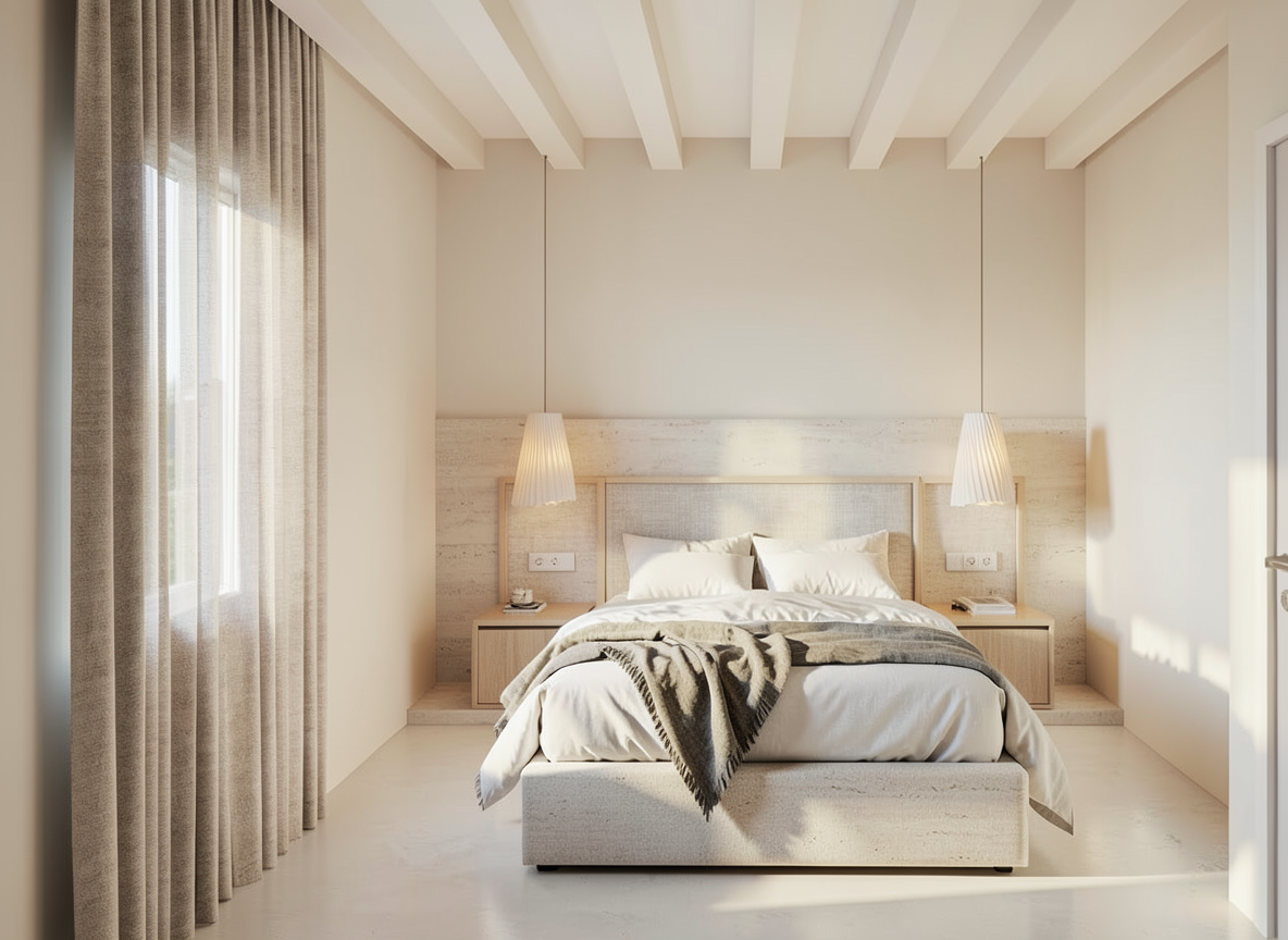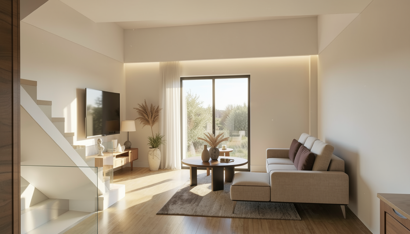 use the provided enscape render as base reference keep exact layout proportions and camera angle enhance natural lighting and refine materials add elderly man and woman drinking coffee at table add potted plant in corner and large framed picture on the wall in the left side of the room add a coffee machine in the kitchen and a few kitchen accesories