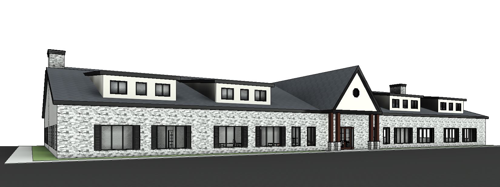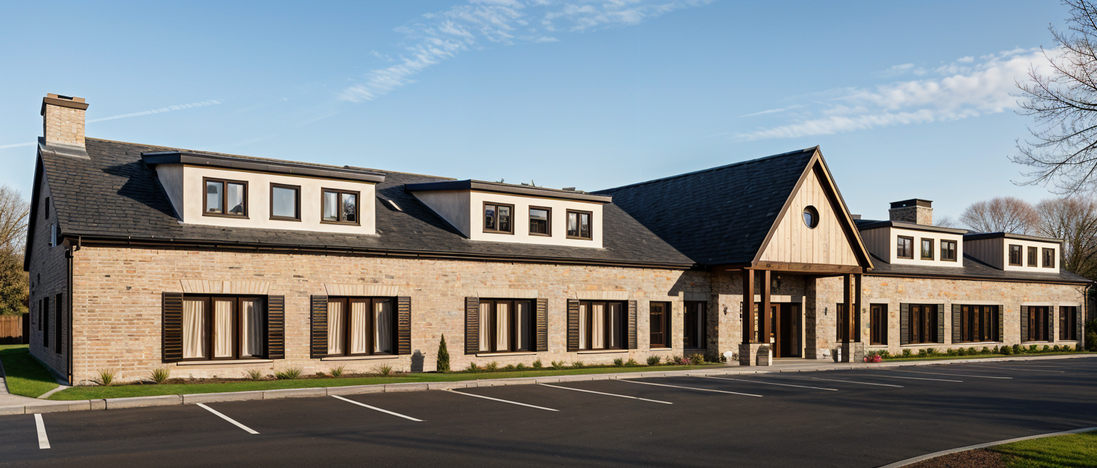 sunset in the autumn season make building and surroundings photorealistic colors are different shades of grey black and dark brown angle parking spaces in front of the sidewalk grass with short landscaping in between the building and the sidewalk