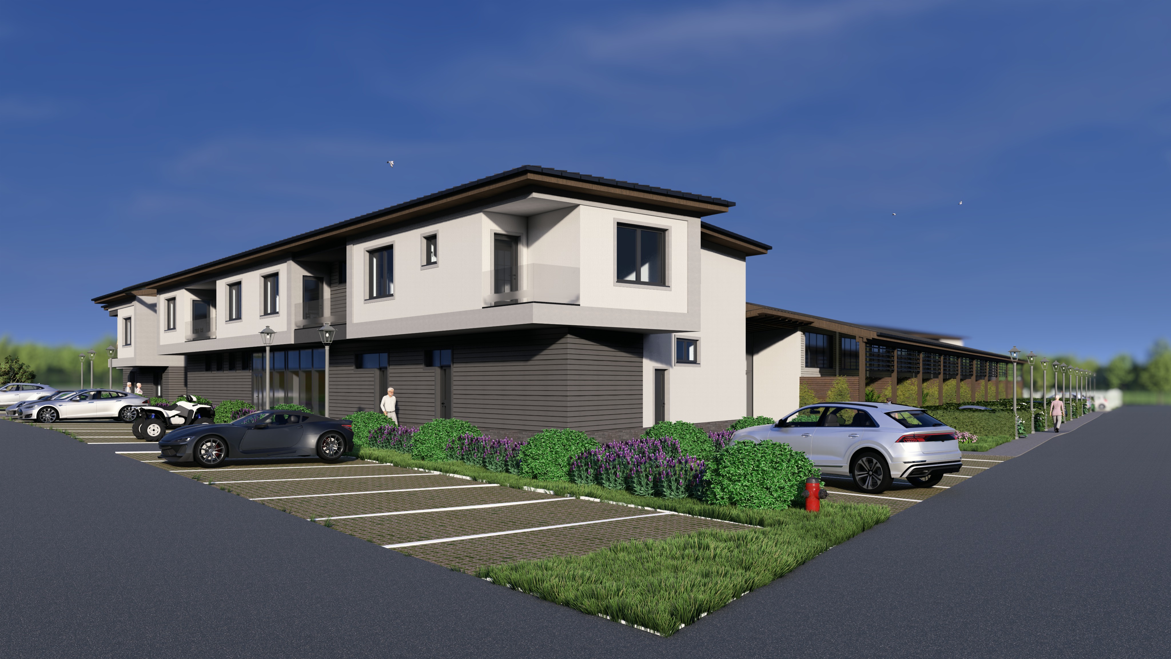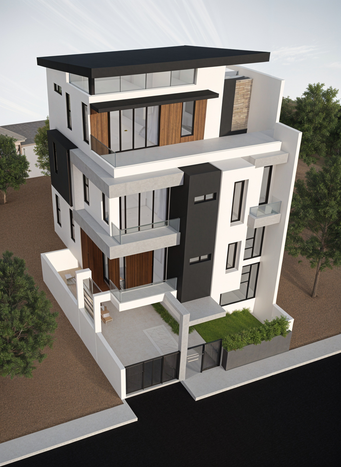 ultra realistic architectural rendering preserve original design and materials modern residential building oblique perspective view warm natural sunlight soft shadows refined facade textures realistic glass reflections subtle interior lighting high end landscaping people walking naturally cars with realistic reflections cinematic but natural atmosphere depth and ambient occlusion photorealistic 8k detail