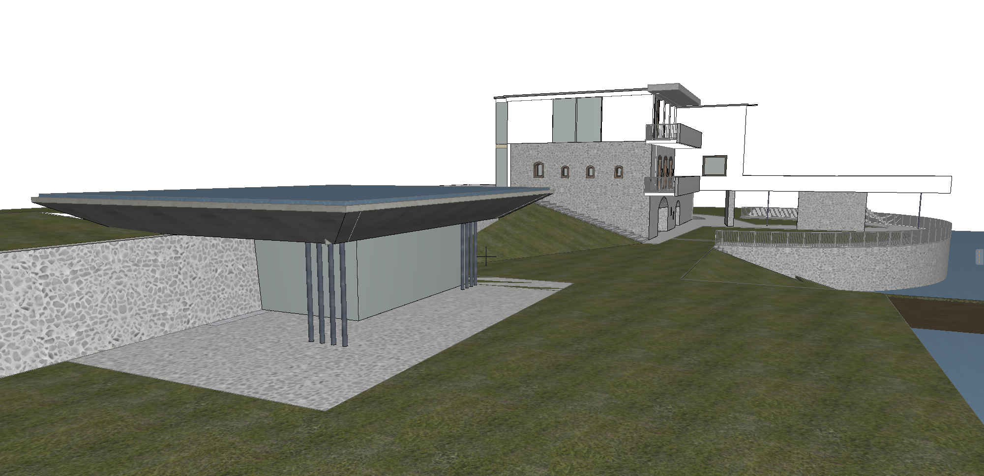 house surrounded by greenery overlooking the lake large transparent windows with furnishings inside outdoor kitchen on the stone wall exposed reinforced concrete roof