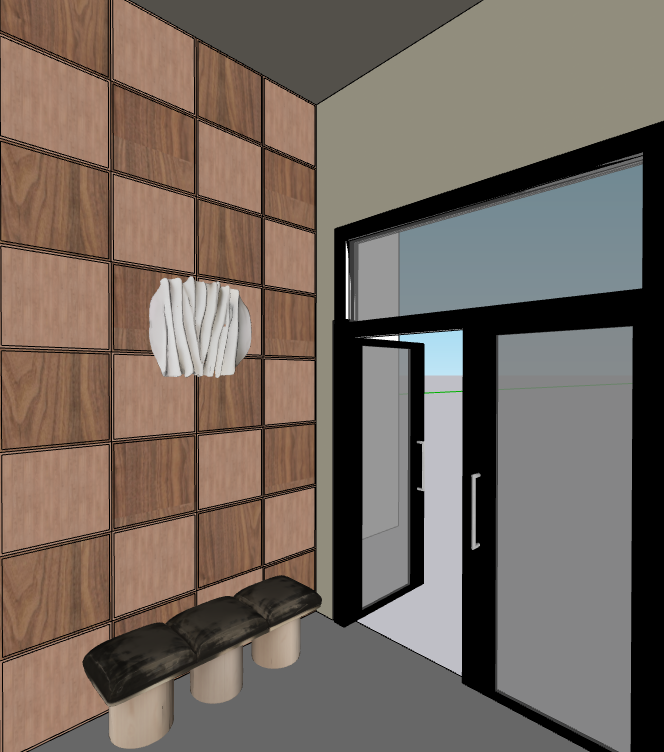 interior of a modern elegant room featuring a wooden panel wall with rich warm walnut tones the wall art is a contemporary sculpture with a soft white texture the bench is a sleek design with a dark brown cushion and light wood cylindrical legs the floor is a smooth matte ivory the atmosphere is minimalist with ample natural light streaming through large glass doors creating a calming and inviting ambiance
