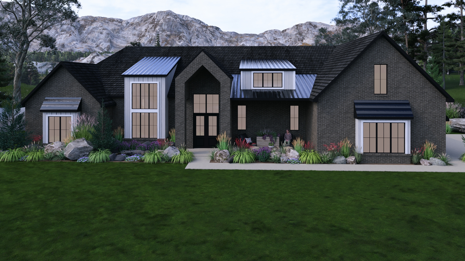 create a stunning render of a rural modern house nestled against a mountainous backdrop the house exterior features dark charcoal brick and sleek metal roofing in silver and black tones highlight the large windows with frames in a soft warm beige surround the home with lush landscaping including vibrant green grasses colorful flowers in red purple and pink and strategically placed natural rocks the foreground showcases a rich green lawn leading up to the house in the background depict rolling mountains with textured gray and white rock faces set against a sky of soft blue with subtle cloud patterns set the atmosphere to be tranquil and serene with warm inviting light casting gentle shadows