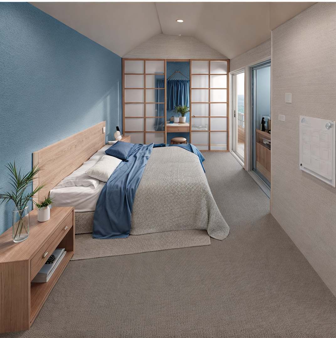 smooth white facade with louvers in the middle of the side wall front road landscape with trees surrounding the building add car parking inside the building with hood facing the column