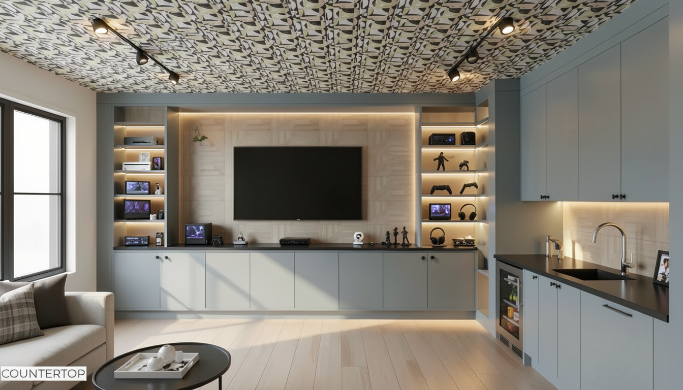 remove the ceiling track lighting and replace it with the lighting in the reference image evenly space the lights across the ceiling in a symmetrical layout casting soft warm ambient light