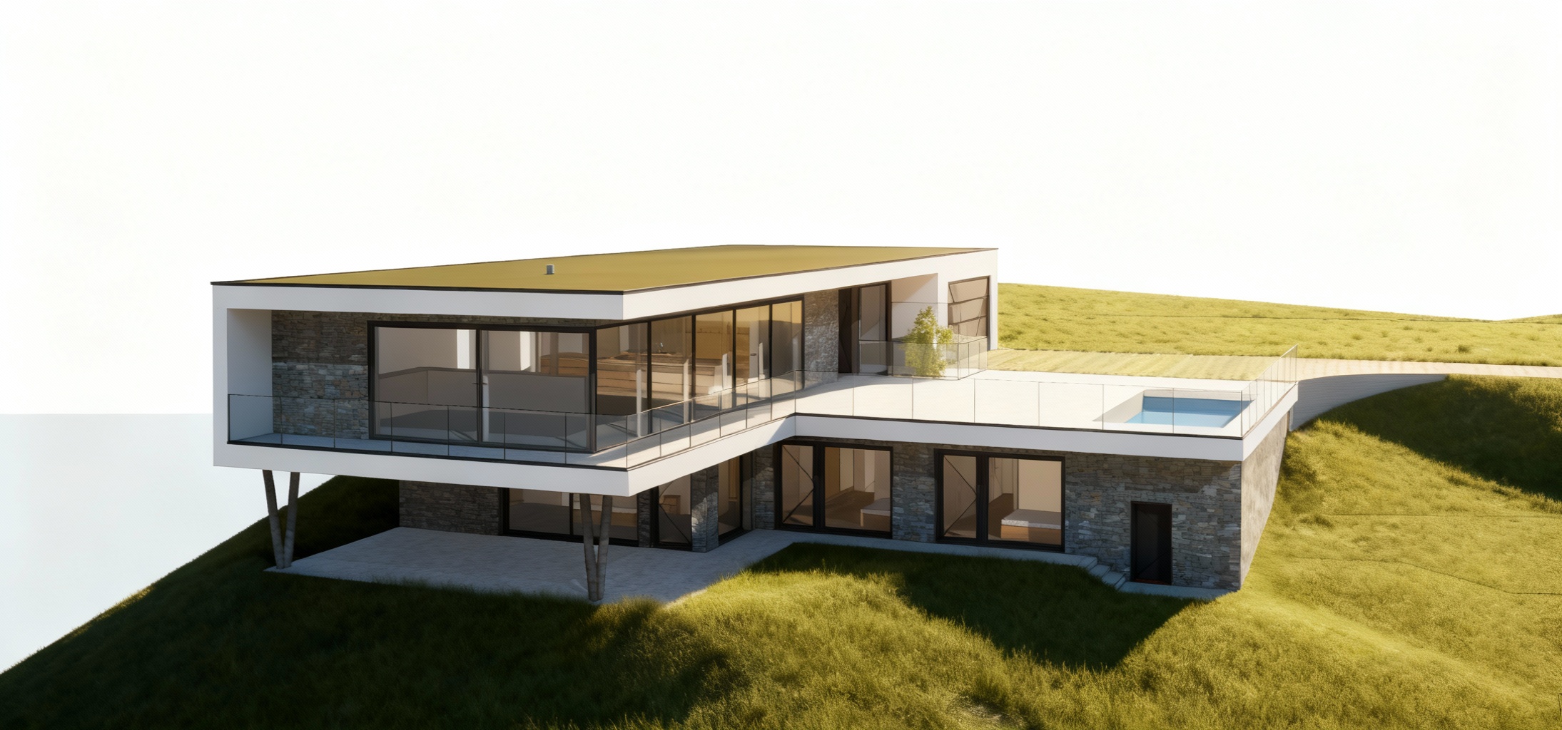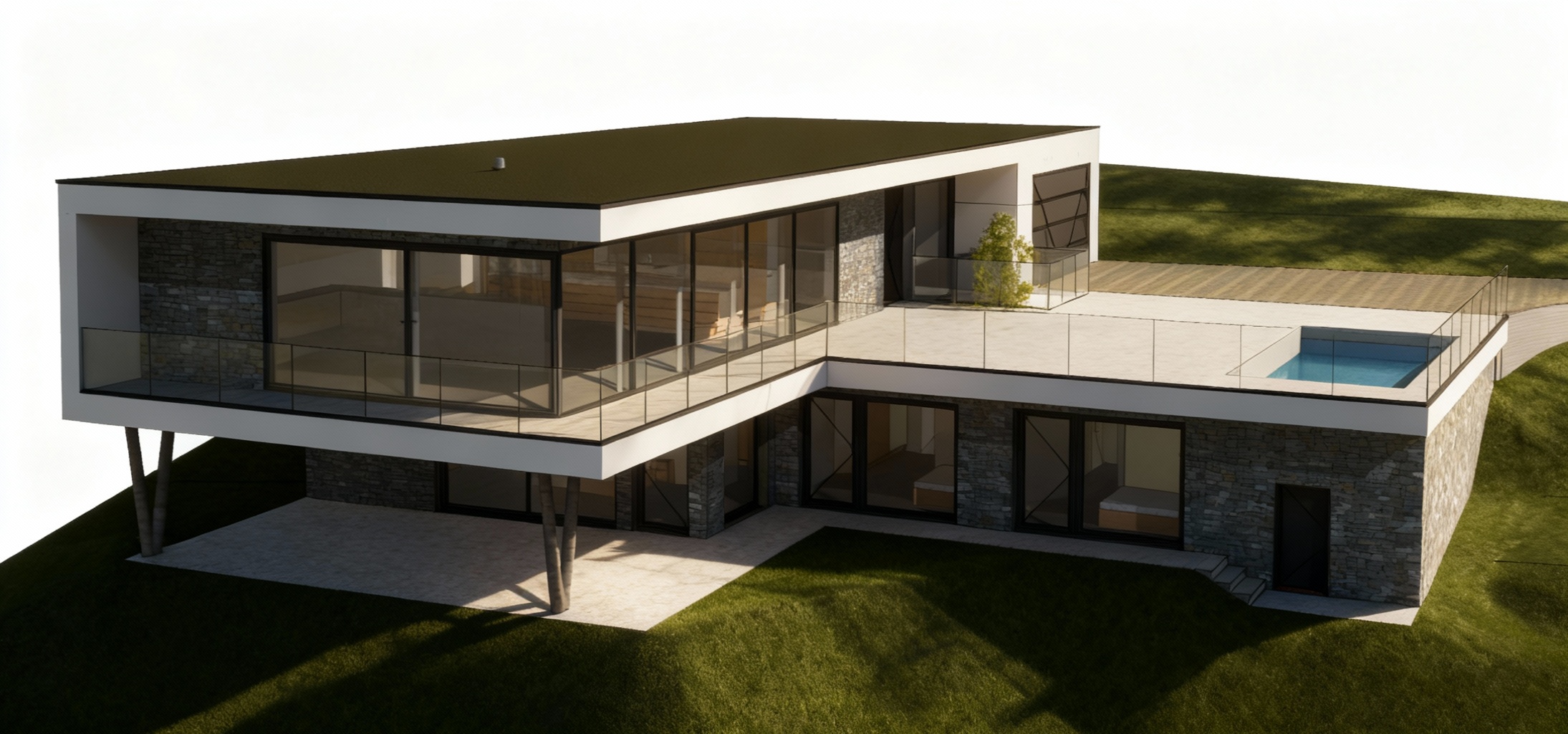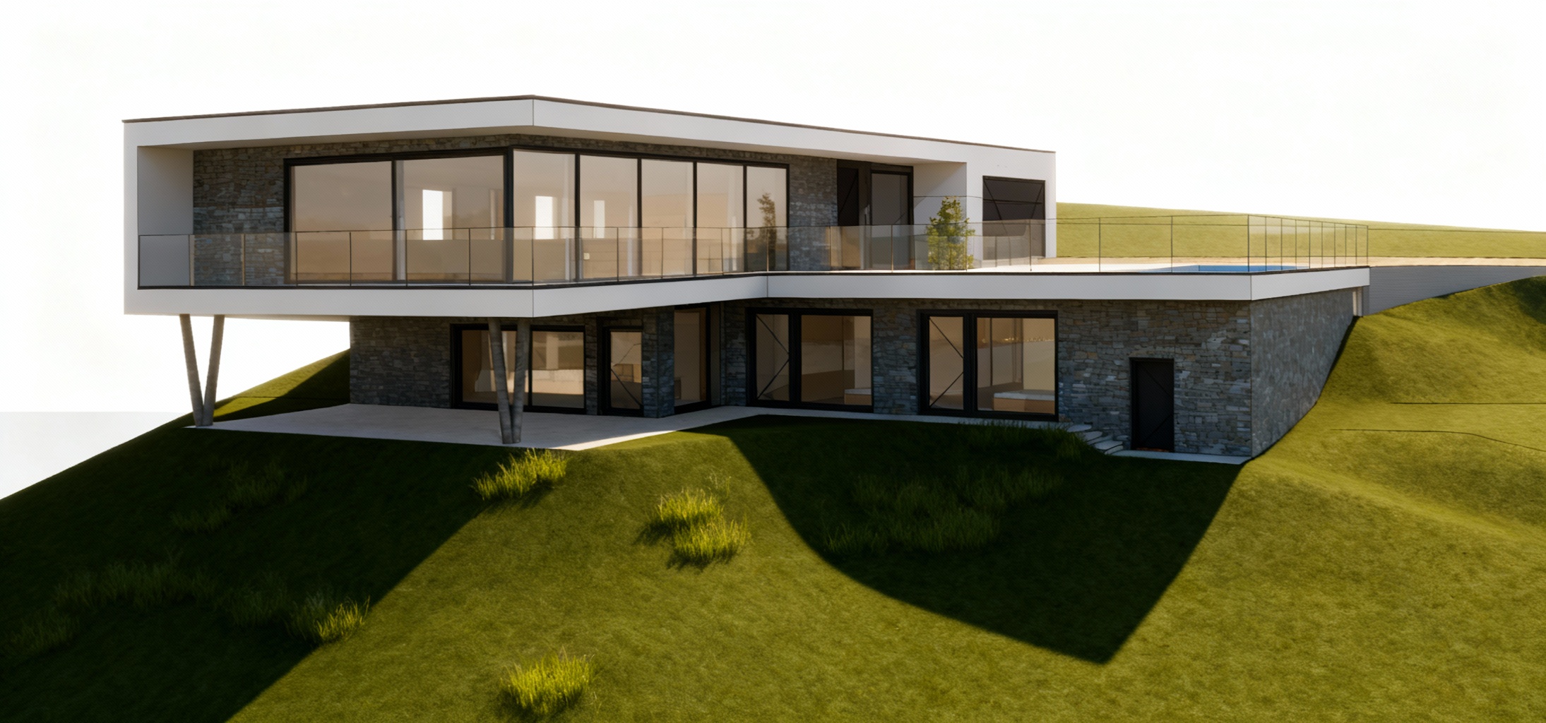 keep the same aerial view of a modern suburban neighborhood featuring rows of minimalist white and grey plaster houses with flat gray bitumen roofs and len to without wall next to it some of the roofs have solar panels installed the houses are neatly aligned each surrounded by lush green lawns and separated by elegant red boundary lines change red line to dark grey metal wire fences building height scots pine line the gray asphalt roads and dark grey paving in both sides of the road adding a natural touch to the geometric layout there are no trees in the borders of the picture the scene is bathed in soft warm sunlight creating a serene and harmonious atmosphere