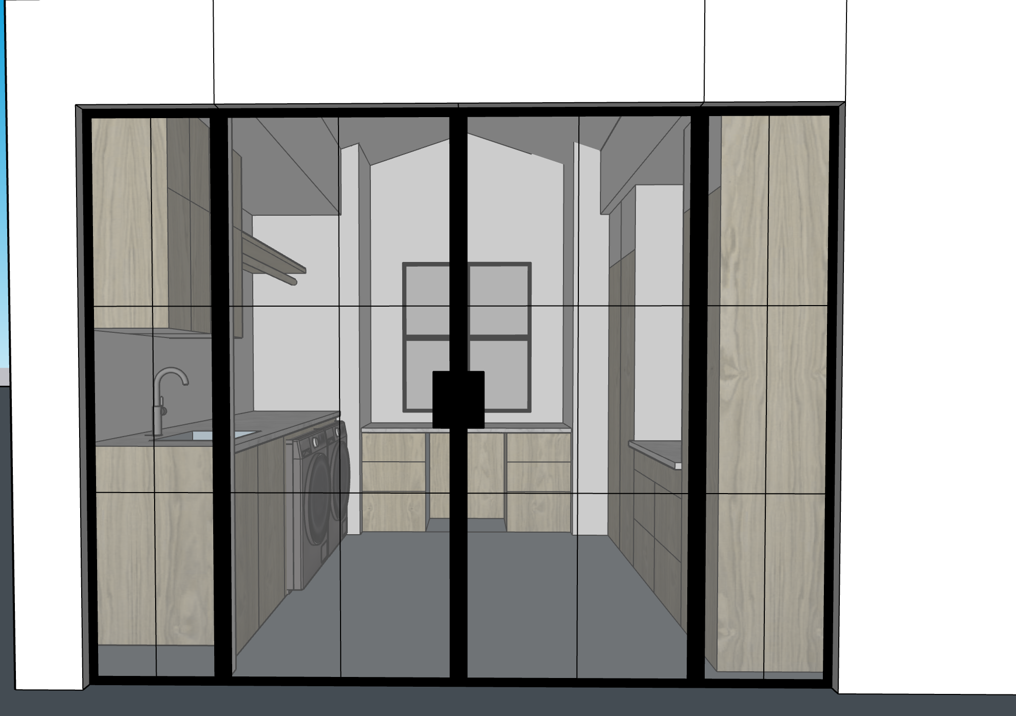 add grids to the windows change the floor to light wood change the cabinets to a greyish green color