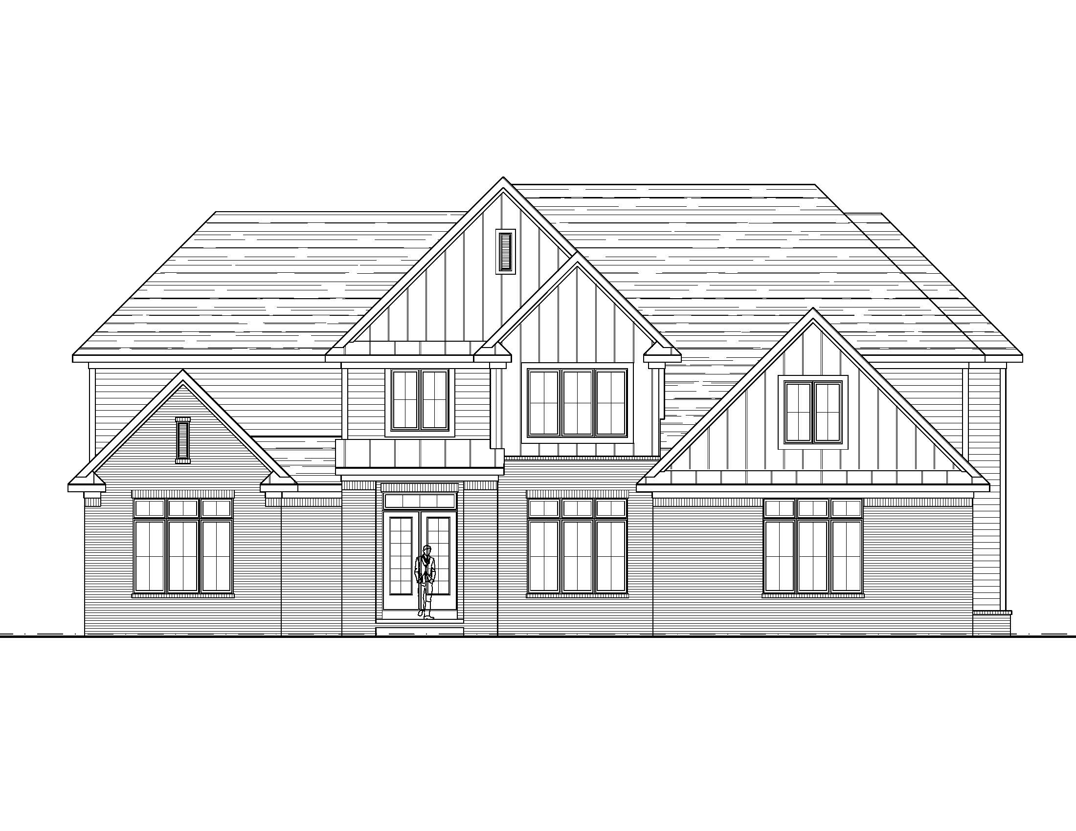 7pm evening a traditional two story house with a sleek design featuring white board batten and horizontal siding with dark brown red brick the roof is a dark charcoal color adding contrast large black framed windows dominate the facade reflecting the clear blue sky with a few white clouds the front door is dark stained wood surrounding the house a lush green lawn with colorful flower beds in shades of pink lavender and yellow the atmosphere is serene and welcoming with evening sunlight casting gentle shadows do not modify the massing as shown