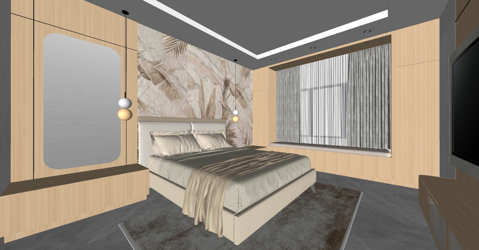 generate a realistic render of a master bedroom interior showing accurate material colors true textures and natural reflections ensure mirror reflections are clear and realistic without distortion provide cove ceiling and illumination for light fixtures retain the exixting flooring texture