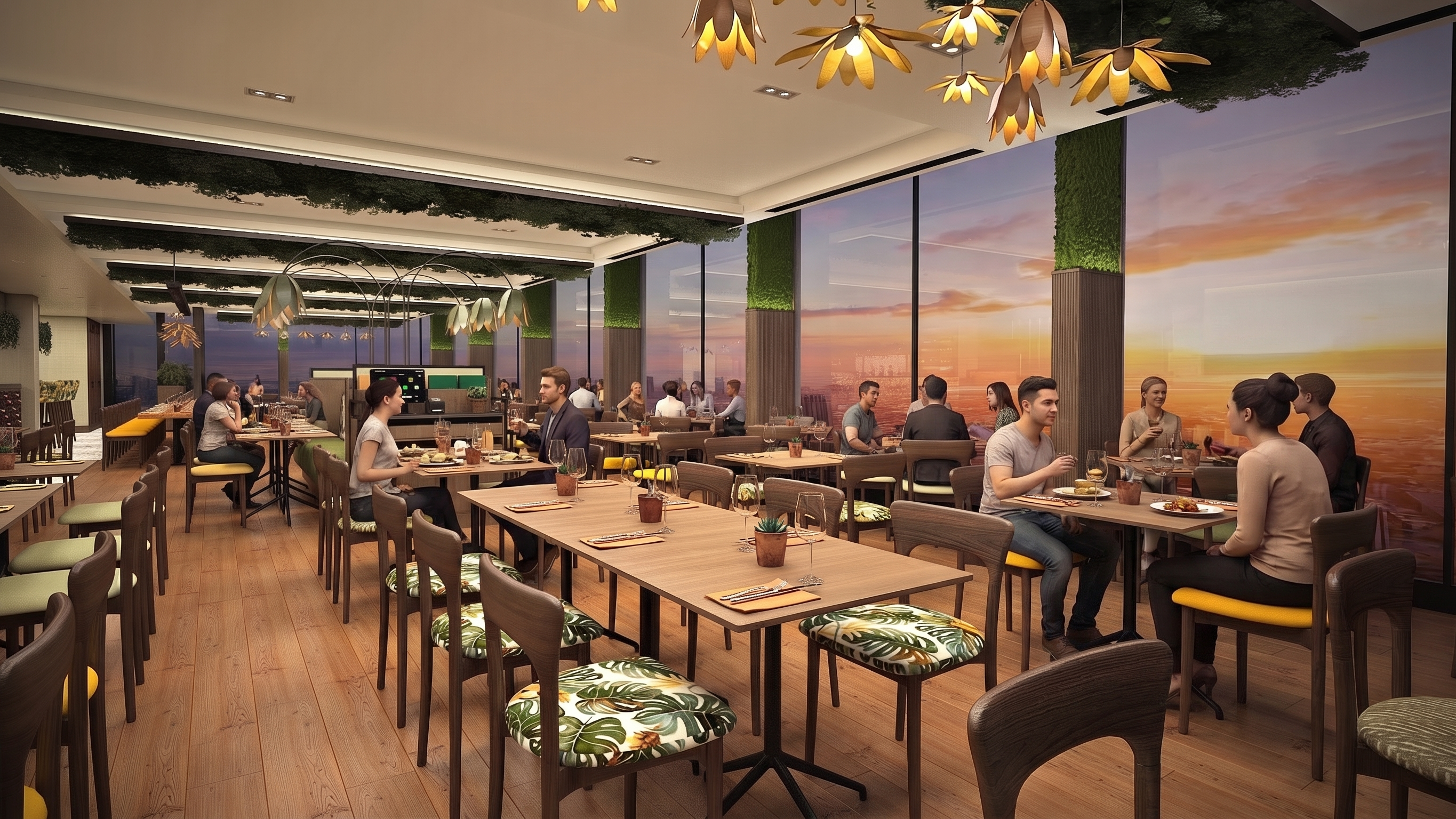 do not change any geometry outside of windows light coming from linear pendant above island bright afternoon light with shafts of light add square can lights to ceiling room is 20 above the ground so no landscape visible next to windows dense hardwood forest in distance