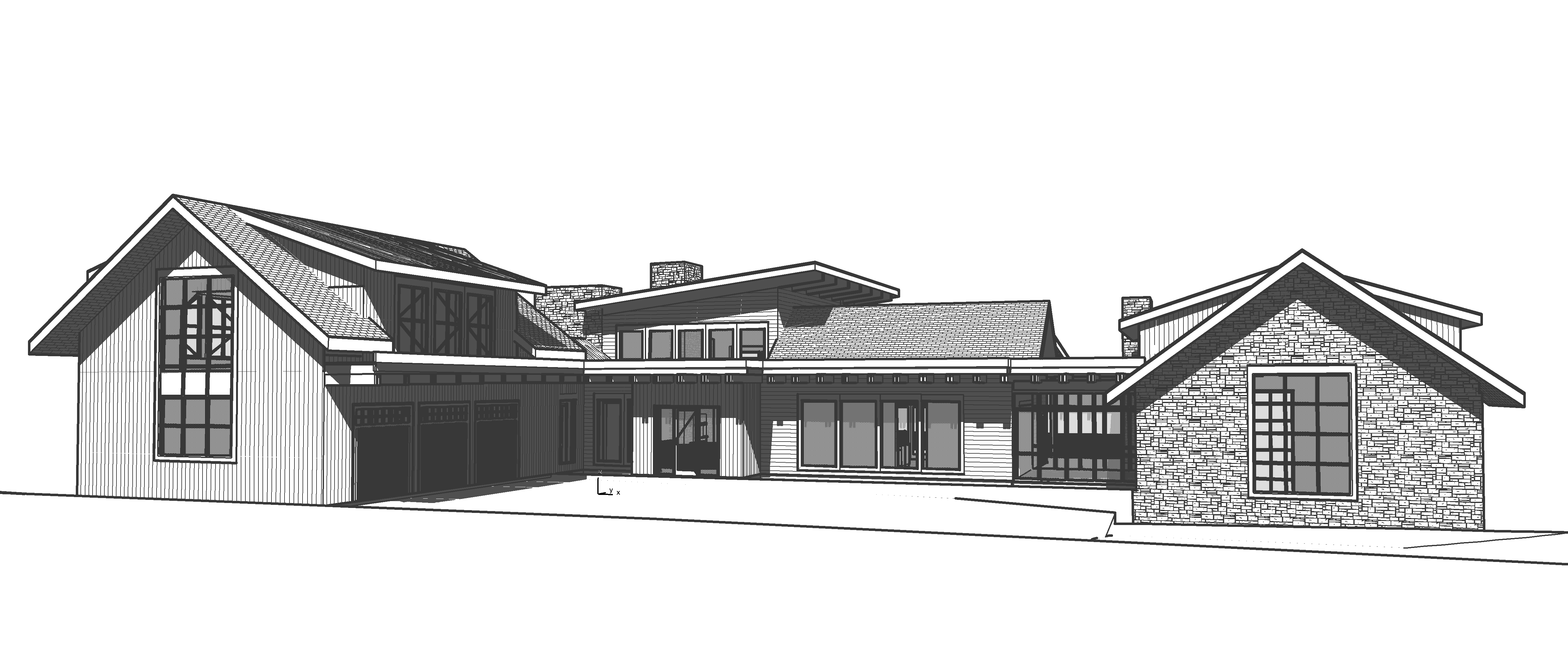 ski home with snow on the roof with snowy forest and mountains in the background view looking east with sunset behind camera gray wood siding stone