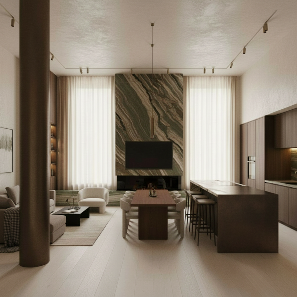 ultra high resolution 8k architectural interior rendering editorial quality architectural digest feature level hyper real materials physically accurate lighting layout do not alter composition open concept living dining kitchen camera centered symmetrical composition 35mm lens eye level balanced framing of fireplace and island critical corrections remove the horizontal stone slab running wall to wall at floor level behind the fireplace the oak flooring must run continuously across the entire back wall the fireplace stone must begin directly from the oak floor and extend uninterrupted to the ceiling no base plinth no continuous slab band the breche fantastique fireplace is a single vertical monolithic slab only fireplace full floor to ceiling breche fantastique darker dramatic cut bookmatched vertical orientation honed finish soft grazing light to emphasize veining linear black fireplace opening centered tv floating island top and waterfall ends light silver travertine seating side full vertical face facing dining table completely clad in dark anodized bronze metal full height full length no toe kick no trim no inset panel flush plane matte oxidized finish with subtle tonal variation architectural mass travertine should appear to sit on a bronze volume remove low stone base there should be no stone wrapping across the bottom of the back wall only wood flooring visible dining area dining table centered with fireplace henge inspired sculptural table stone or walnut with bronze base cool taupe sculptural chairs more contemporary and refined island stools slim blackened steel frame warm taupe leather minimal backs even spacing materials walls warm off white lime plaster floor wide plank white oak matte cabinetry dark walnut flat panel metal accents dark anodized bronze matte lighting warm 2700k soft indirect realistic shadow depth no blown highlights no haze no softness blur crisp global illumination quality control settings ultra sharp high ray tracing high reflection detail no noise no blur no compression artifacts no painterly texture photoreal only negative prompts no wall to wall base slab no stone plinth no toe kick bronze strip no glossy metal no green stone island no oversmoothing no cgi softness no low resolution no ai blur no cartoon lighting