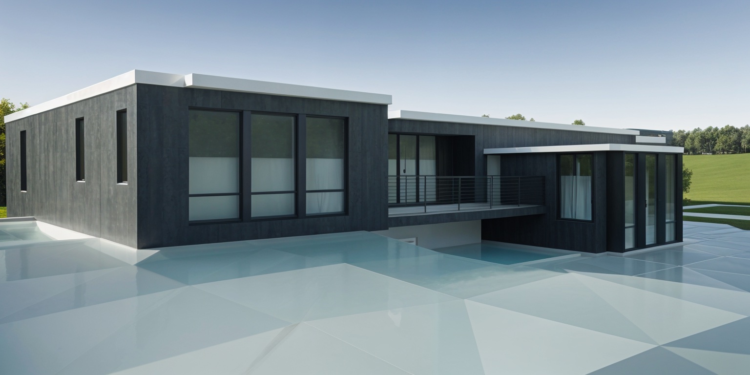 modernist exterior shot natural grass surrounding the building dark gray metal fascia a few clouds in sky architecture