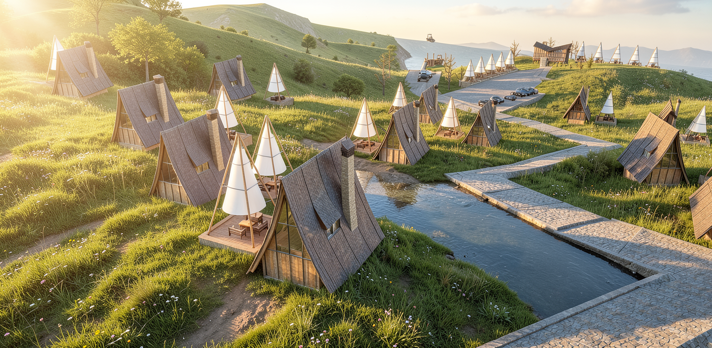 photorealistic architectural render of a family house with a classic european residential character the house features a red tiled roof white window and door frames and white exterior railings on balconies and exterior stairs the facade is finished in ral 6013 reed green a muted desaturated green tone with a refined and elegant appearance clean proportions high quality materials realistic textures natural daylight soft shadows and a harmonious overall color composition