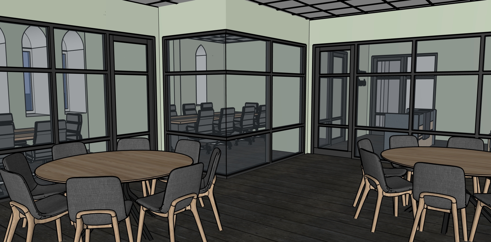 maintain reality add a few people in the room and in the adjacent room wall to be a light green grey wallcovering