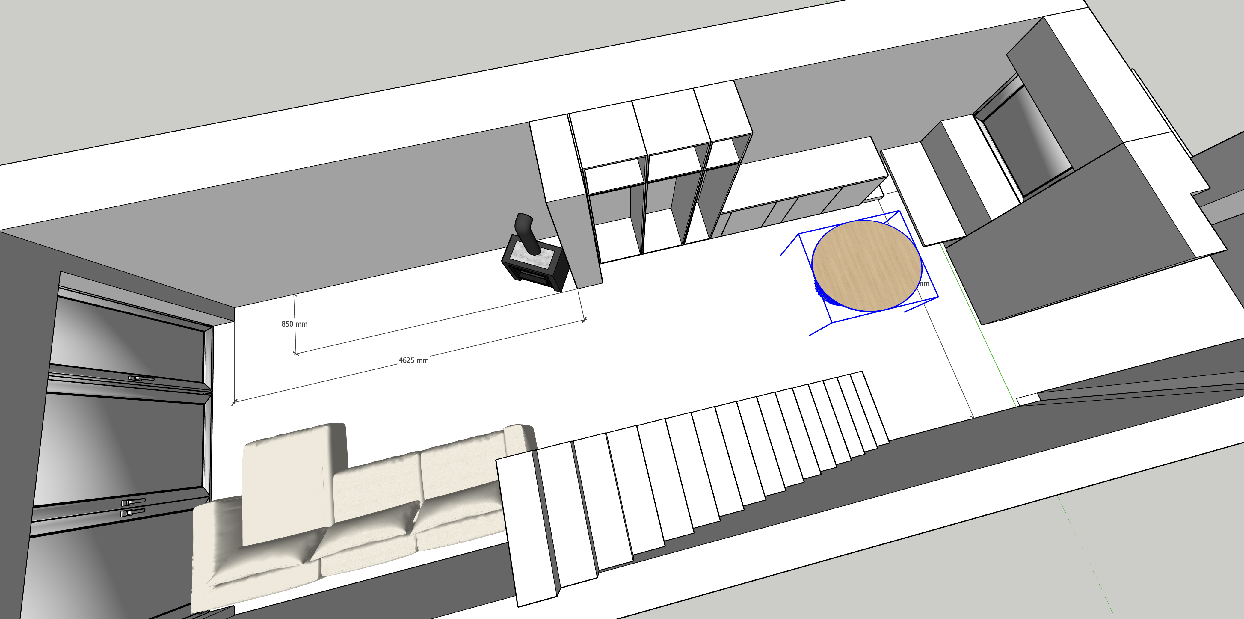 keep the original layout and geometry of the space exactly as it is design an interior for a mountain apartment add a dark kitchen with wooden elements modern alpine style place a kitchen along the right wall dark matte cabinets combined with natural oak wood add a wooden dining table for 4 people in the center of the room place a tv on the wall near the sofa with a low wooden tv cabinet style modern alpine mountain apartment warm cozy natural materials oak wood stone dark kitchen cabinets lighting warm ambient lighting cozy atmosphere colors dark kitchen oak wood beige sofa natural tones keep windows walls and structure unchanged respect the original floor plan do not move walls windows or doors do not change the camera angle only furnish and design the interiorstyle reference modern alpine chalet interior natural oak wood dark kitchen stone details warm lighting luxury mountain apartment keep the layout it is view from above