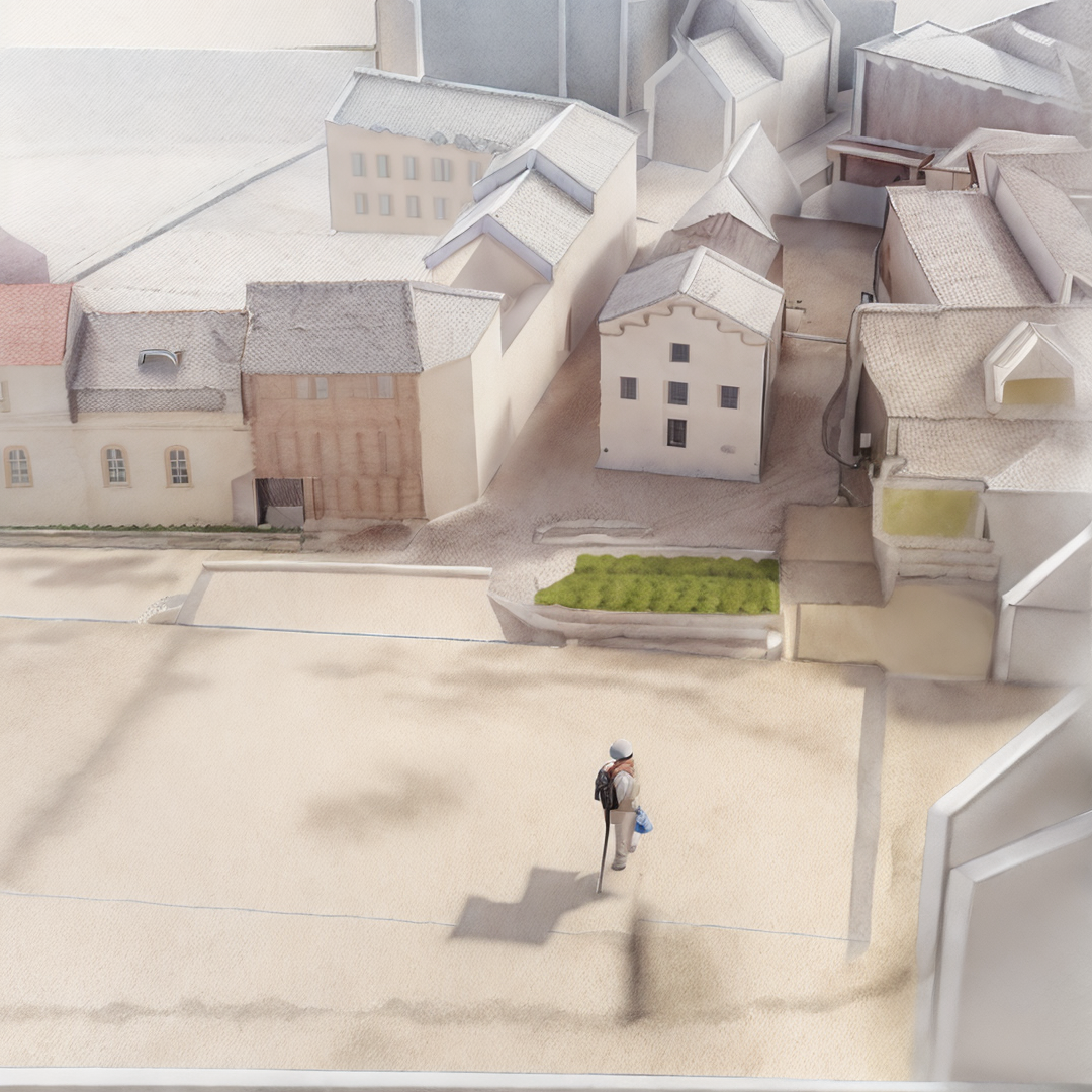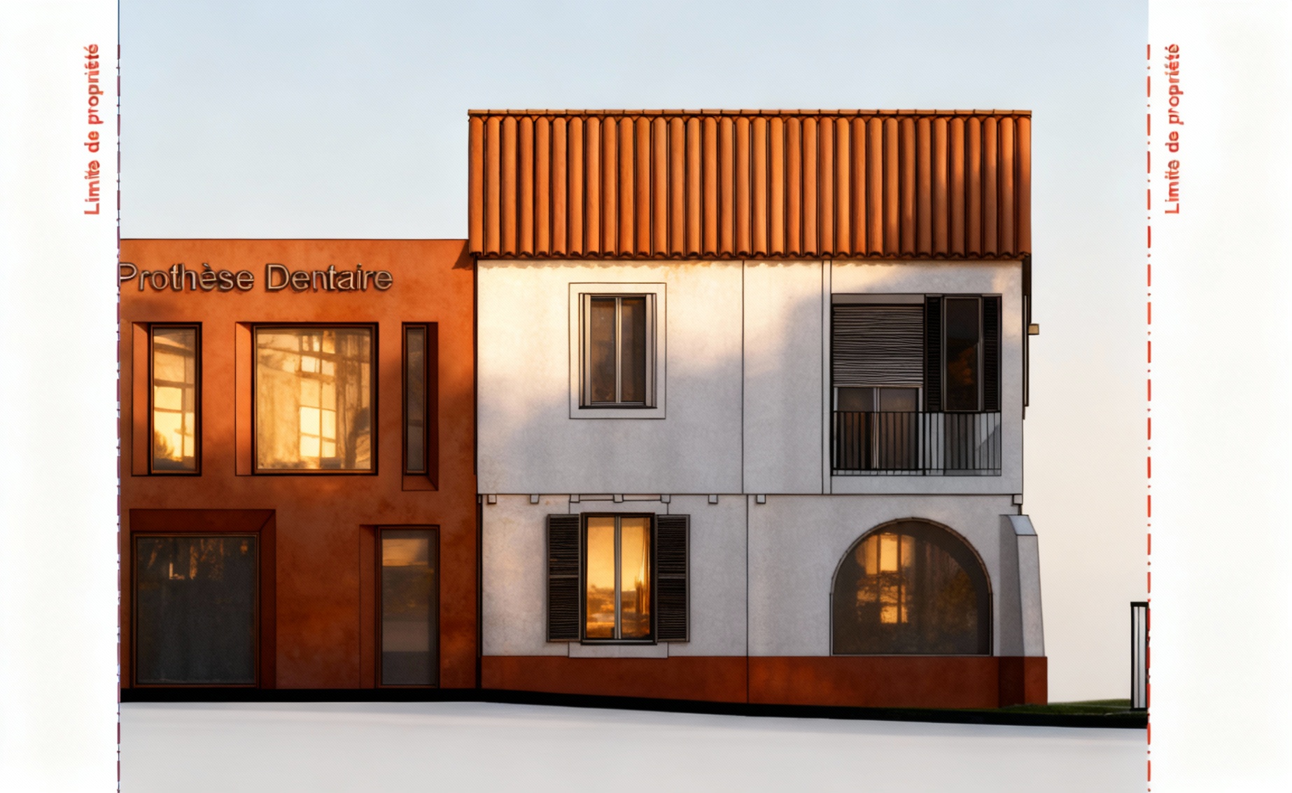 beaucoup de lumi res et de reflets dans les fen tres la couleur du soubassement de la maison de droite et le b timent de gauche sont la m me r duit l apparence des traits noirs rendu r aliste the color is more terracotta more light on the building realistic view
