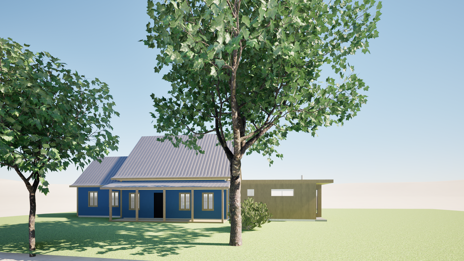 rendu photor aliste textures r alistes avec variations et imperfections bois naturel d taill lumi re naturelle douce ombres r alistes profondeur terrain en pente montagne en arri re plan mettre la section de la maison droite plus pale beige la m me couleur que les colonnes de la maison