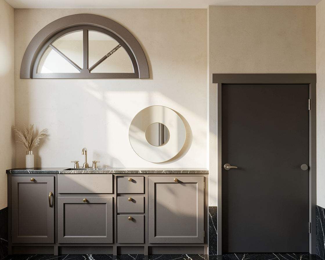 dark brown painted kitchen including central wall cupboards with walnut island with reeded glass doors at top marble splashback light oak floor to front of camera