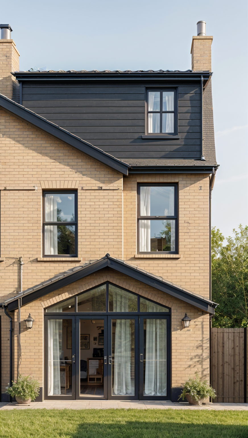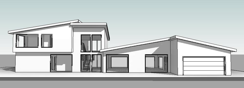 photorealistic render exterior view modern residence with white stucco walls dark blue metal roof with dark blue trim windows with black frames colorful mediterranean landscape
