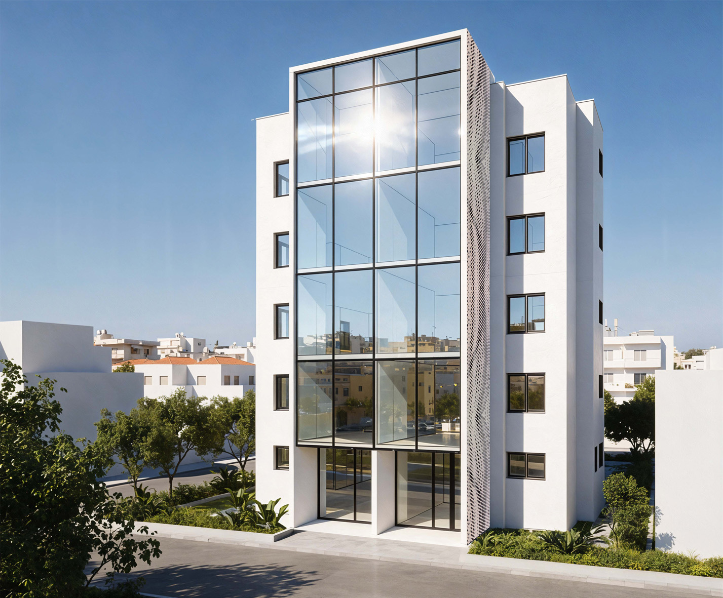 scene photorealistic architectural visualization of an office building in nicosia cyprus same camera same framing same geometry this is a refinement not a redesign architecture do not touch do not change building shape do not change facade composition do not change window grid do not change proportions or volumes no geometry edits architecture must remain exactly identical environment context main task add a highly realistic urban environment behind and around the building low rise residential and office buildings typical of nicosia mediterranean city density realistic depth and scale environment must feel real not generic buildings placed naturally in the background not blocking the main facade material realism keep all existing materials improve material quality only pbr realism metal surfaces replace current metal look with more realistic architectural metal correct roughness reflectivity micro texture physically accurate behavior no color changes no new materials glass reflections realistic architectural glass strong but believable reflections of surrounding buildings trees sky proper fresnel effect no mirror like glass textures high resolution realistic textures correct scale no stretching clean professional facade quality lighting natural mediterranean daylight cyprus sun soft but clear shadows balanced exposure sky clear cloudless sky mediterranean blue natural gradient realistic atmosphere style ultra photorealistic architectural render professional visualization real world look no ai art style restrictions critical do not redesign do not change colors do not add architectural elements do not stylize only realism environment textures materials light