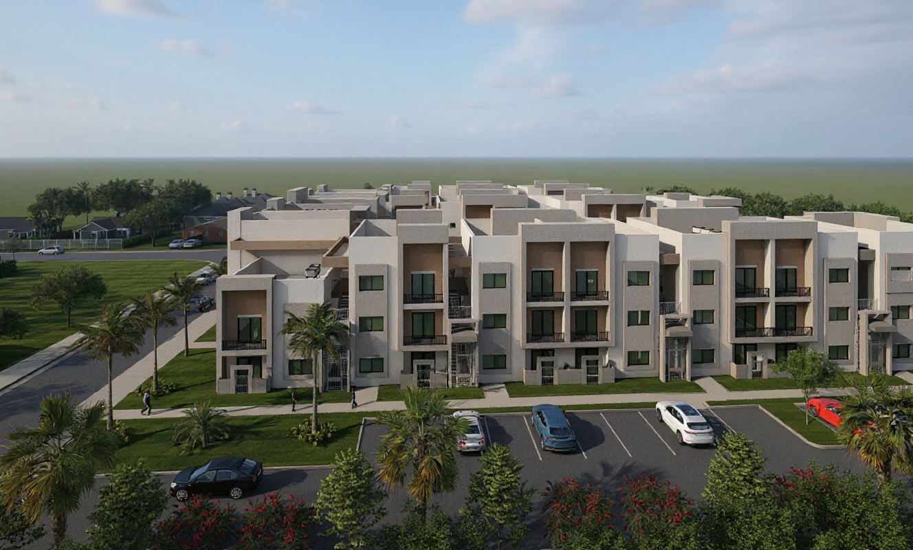exterior shot photo realistic rendering with white beige and toupe stucco black roof black window frames lawn extensive native planting background trees daytime single family neighborhood setting