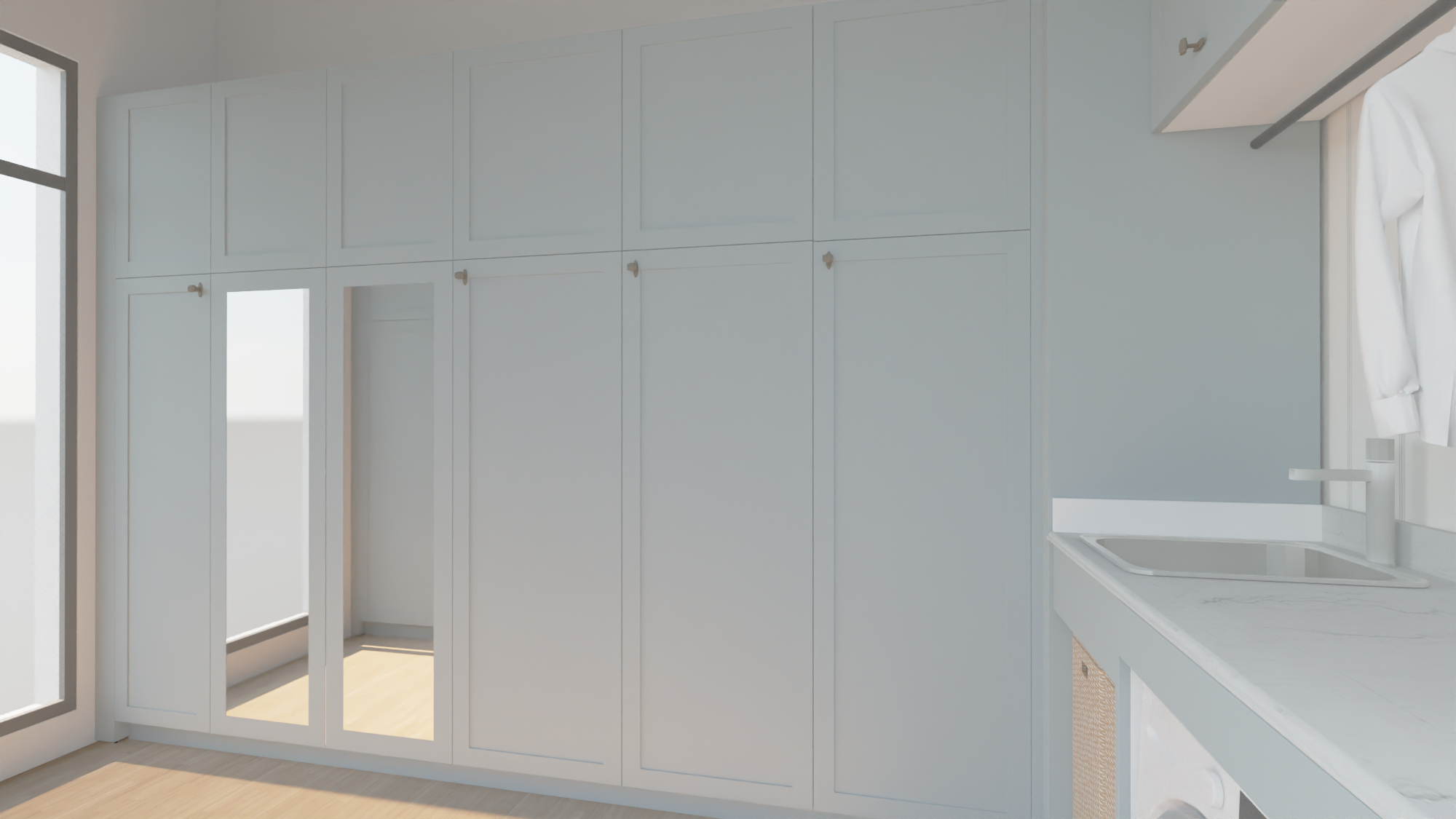 crea una imagen fotorelaista realza texturas e iluminacion el lacado de las puertas es un color azulado quita los tiradores de en medio de las puertas