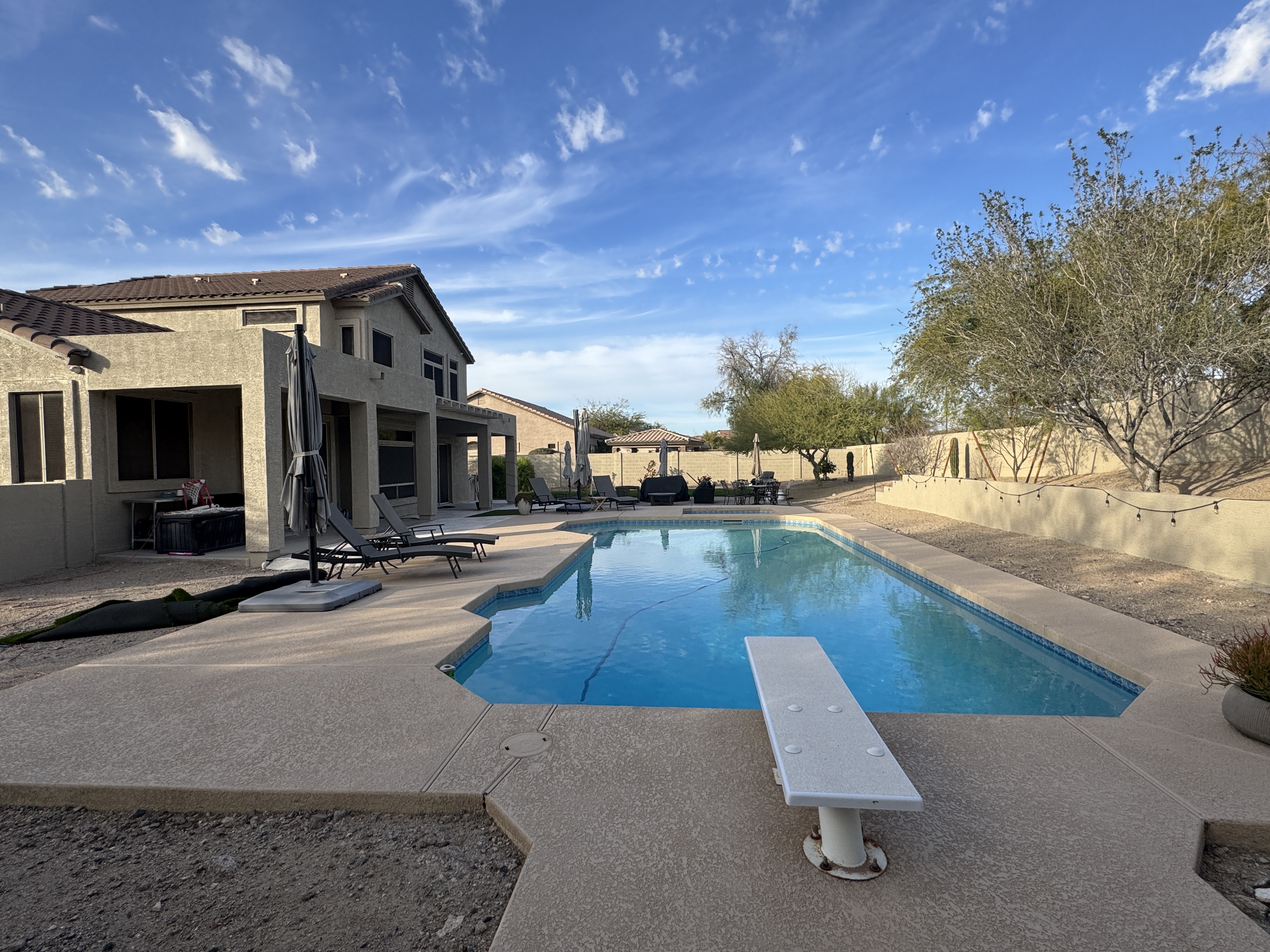 i m looking straight north at the new backyard ramada maintain this view construct a new free standing ramada with 4 wood post and a wood beam painted dec750 bison beige rl 649 wood fascia painted det695 grange hall rl 992 the roof will be concrete barrel shaped roof tiles desert tan the framed wall in the backdrop has adhered cultured stone veneer and 72 long low profile fireplace and a 54 flatscreen tv monitor above to watch american football sports the existing 25 x25 concrete slab is in the rear yard toward the north end to the south there is a 5 walkway of pool deck between the ramada and existing 6 x6 square spa and then a long rectangular pool extending south and out of the picture the pool and spa are centered on the new ramada and the pool is the same width as the ramada there is approximately 12 of pool deck between the pool and spa the pool and spa height are at the level of the walk there is an existing 6 high cmu wall approximately 20 north of the new ramada the cmu wall is painted de6214 pigeon gray rl 570 there is very short green grass between the ramada slab and wall with a 4 wide landscape rock path along the base of the cmu wall place a hip style roof on the ramada on 2 columns on the front connect the ramada to the house with a treliis like the one already on the house use the main house image from the photo make the wall under the ramada 8 long place a 2 way see through fireplace under the tv keep the pool and backyard consistent with the photo image perfect now connect the new ramada to the house with a similar trellis to the existing house perfect can you make the stone wall a little longer can you make the fireplace longer not as tall and make it see through match the pool exactly to the photos image i have uploaded i dont like the stone wall in this image go back to the previous image but make the wall about 2 wider again strictly make the existing house and pool to the uploaded image