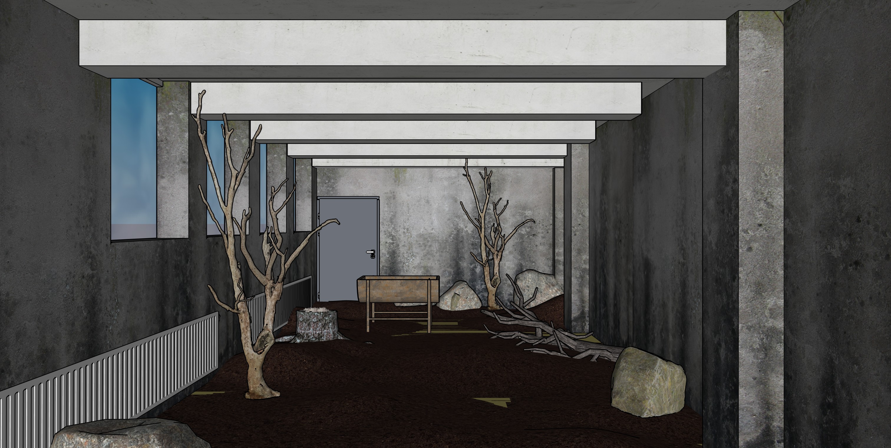 black and white watercolor sketch this is a dark basement but there is some light comming from the windows in the upper left side there are trees and stones indoors and the flooring is coverd with soil architecture
