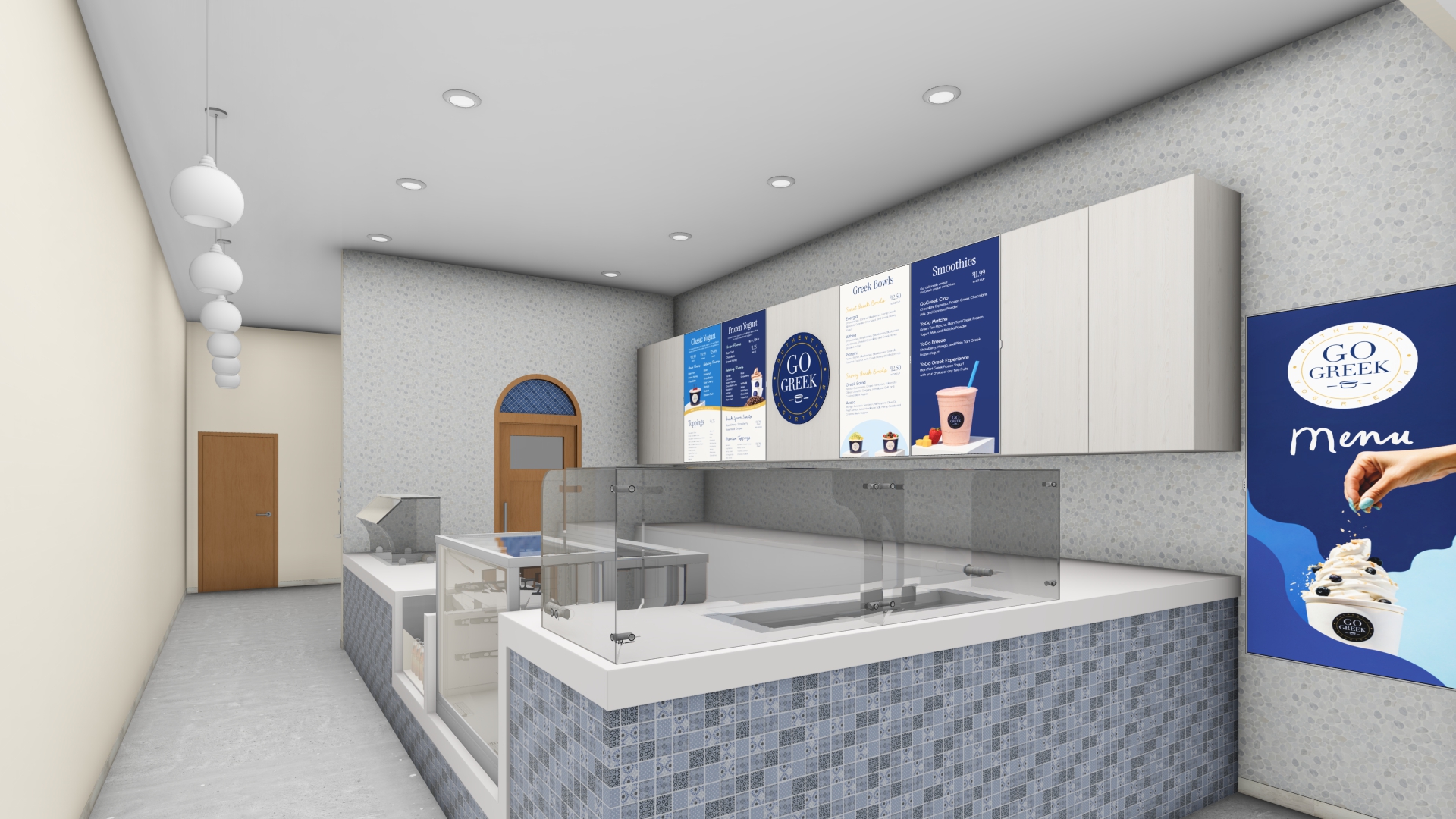interior artificial lighting bright space no sunlight blue backlit go greek sign light washed white wood grain cabinets semi cool colors washed grey pebble tile on kitchen walls light tan walls in hallway