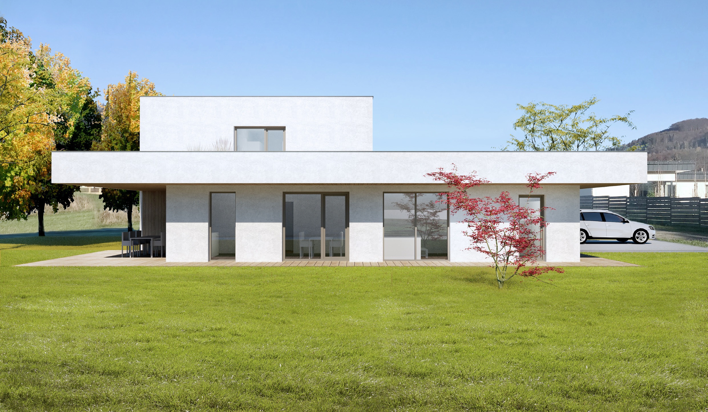 functionalism exterior shot modern minimalist house with a flat roof clean white facade and large glass windows the foreground features a vibrant green lawn with scattered patches of light brown representing a well maintained garden a delicate red japanese maple tree stands in the middle right complementing the serene atmosphere in the background a diversity of trees showcase autumn colors with shades of gold orange and green a sleek white car is parked to the right near a charcoal gray fence the sky is clear blue adding brightness to the tranquil and picturesque suburban setting architecture