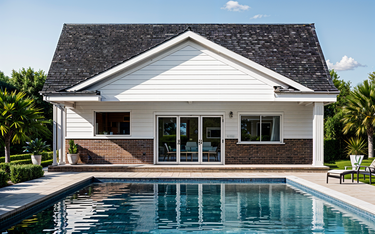 a row of charming suburban houses sits atop a gentle lush green hill basking in the serene glow of a clear blue sky the houses are painted in a soft beige complemented by their dark gray shingled roofs each house features large glass windows that glisten in the sunlight the well maintained garden is beautifully landscaped with small shrubs and plants that add a touch of nature surrounding the houses the distant dense trees provide a tranquil backdrop the atmosphere is peaceful and inviting evoking a sense of community and comfort colors houses soft beige walls dark gray roofs grass vibrant green sky clear blue windows reflective glass trees deep green foliage atmosphere peaceful inviting serene