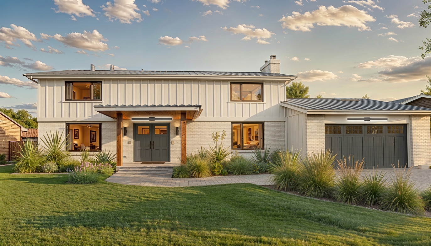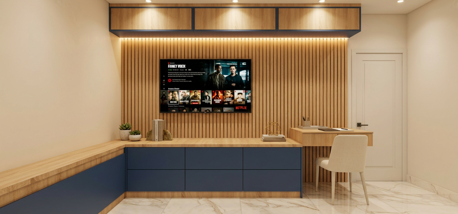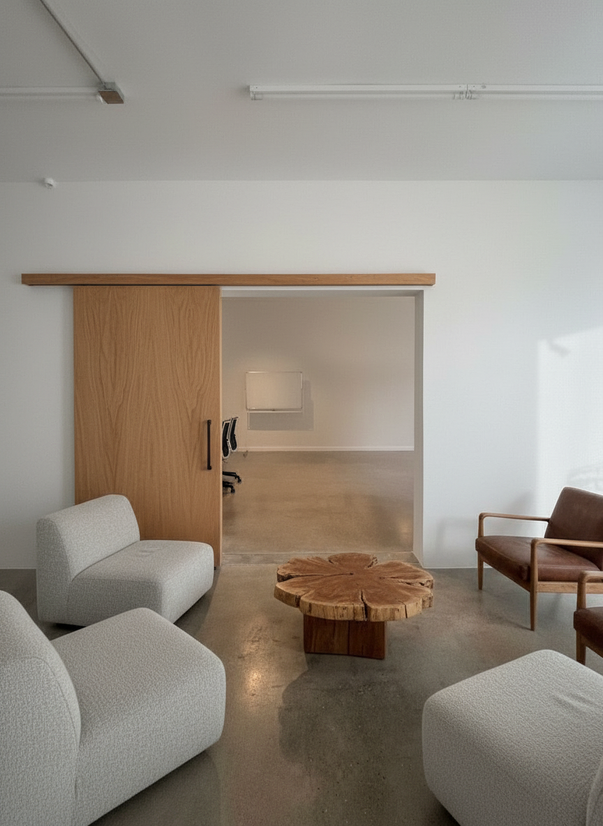 modern scandinavian inspired kitchen interior with warm natural materials and a clean minimalist aesthetic light oak flat panel cabinetry with integrated handles full height cabinets and matte off white upper cabinets large waterfall quartz island with subtle grey veining and seating for three with modern black bar stools panel ready french door refrigerator and 30 inch range oven under cabinet led strip lighting illuminating the countertop light wide plank oak flooring throughout shelving with built in warm lighting displaying minimal decor pieces soft recessed ceiling lights and modern black accent ceiling fixtures neutral color palette of light wood white beige and soft greys 3 feet by 4 feet window above the sink bringing in natural daylight sleek matte black faucet and modern sink integrated into the island photorealistic architectural render ultra realistic materials soft ambient lighting high end residential design wide angle interior shot 4k quality
