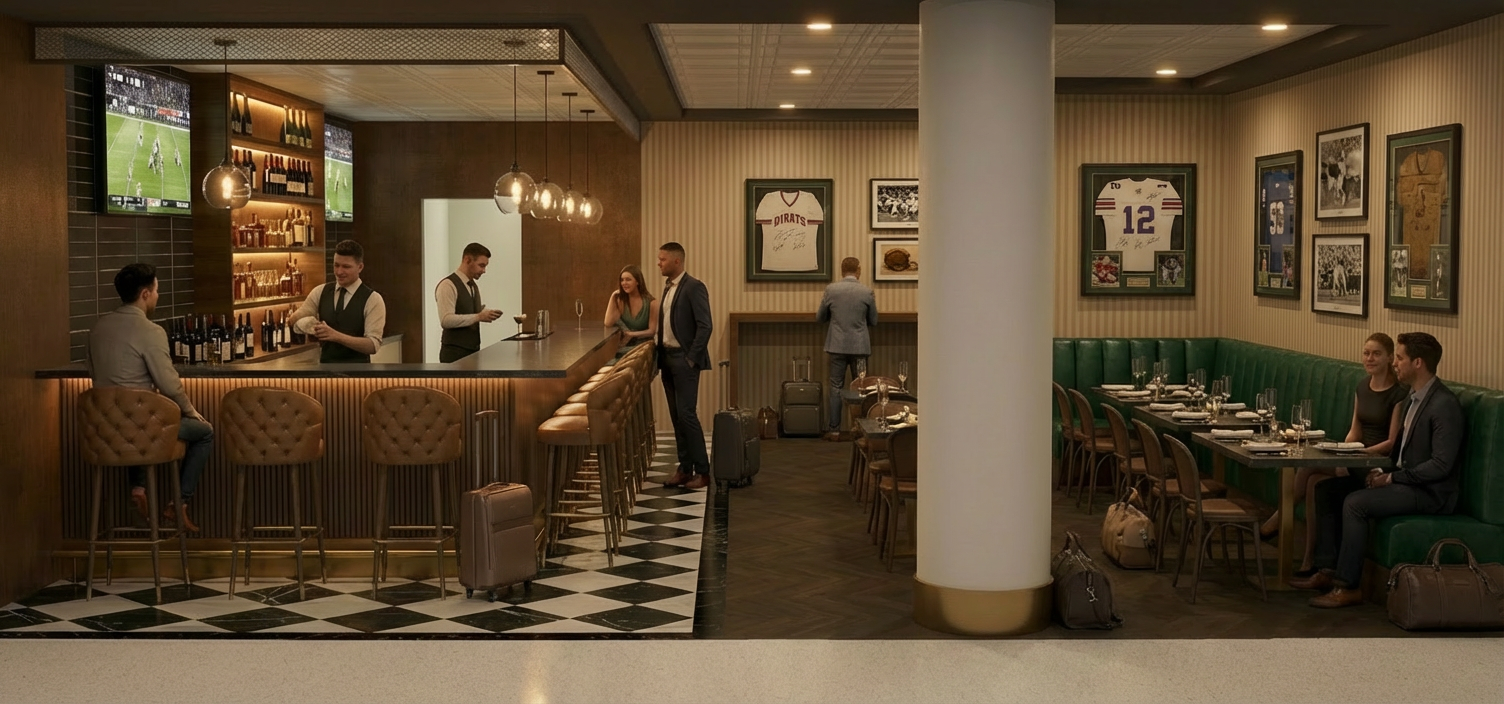 add a pendant light to the right of the single pendant light at the side of the bar evenly space the light fixtures use the same style pendant fixture as the ones currently in the image there should be 2 pendant fixtures at the side of the bar and 6 total pendant fixtures at the bar keep all other materials and the rest of the layout exactly the same