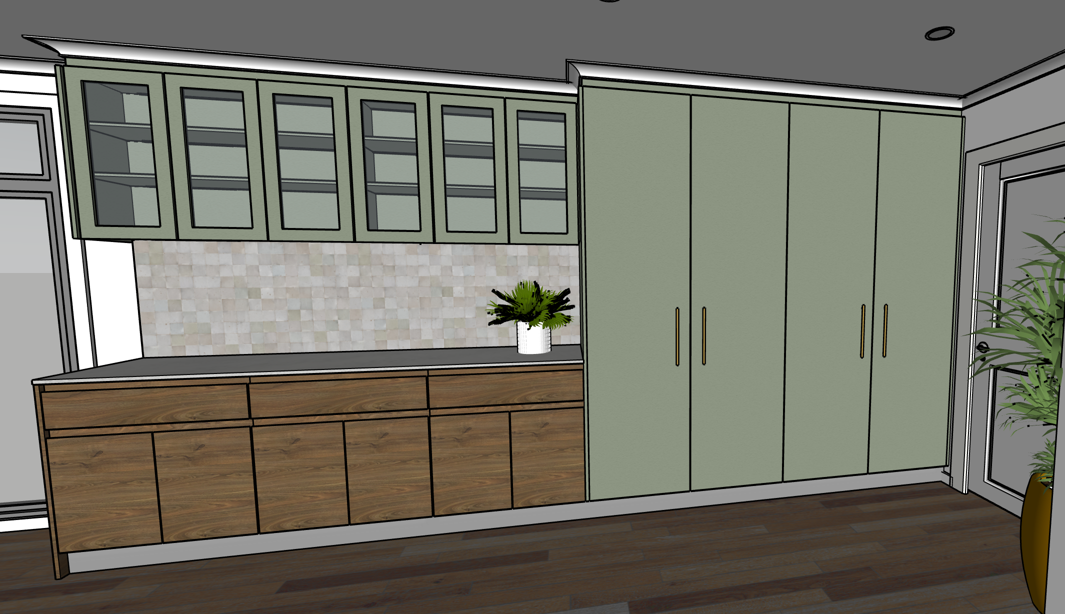 render highest quality textures and photorealism kickboards below cabinets to be brushed stainless steel finish 55mm cornice painted white to match ceiling bulkheads above cabinets to match cabinet colour afternoon sun coming into kitchen under cabinet lighting under overhead cabinets lighting under shelves in cabinets inside cabinets with glass doors