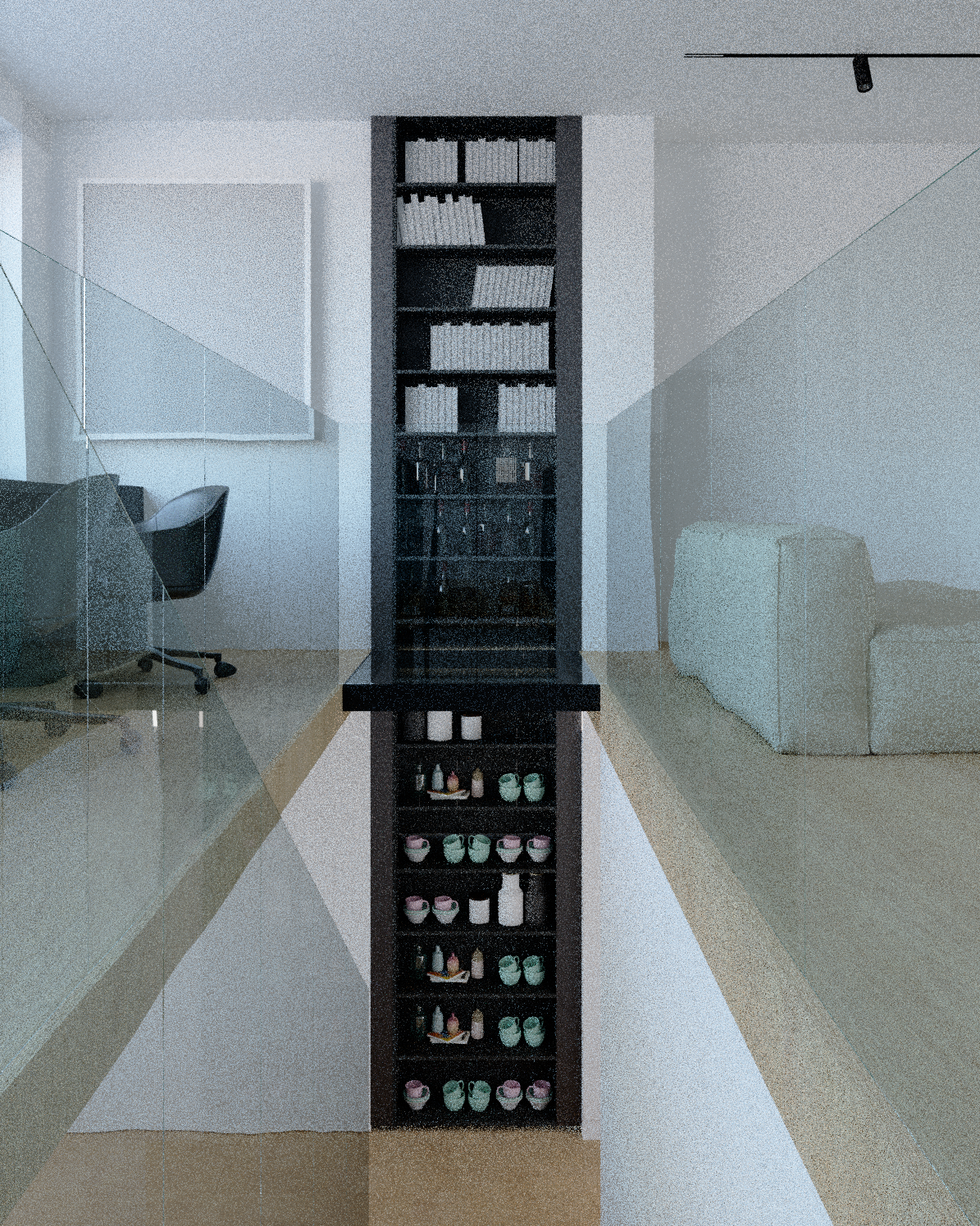 a modern minimalist interior featuring a sleek black bookshelf with two glass doors shelfs with led lightning filled with books and decorative items adjacent is a contemporary workspace with a black office chair the space is divided by glass railings and features light wooden floors creating an airy feel on one side a plush white sofa adds contrast the atmosphere is calm and serene with soft natural light illuminating the white walls and subtle shadows conveying a sense of openness and sophistication